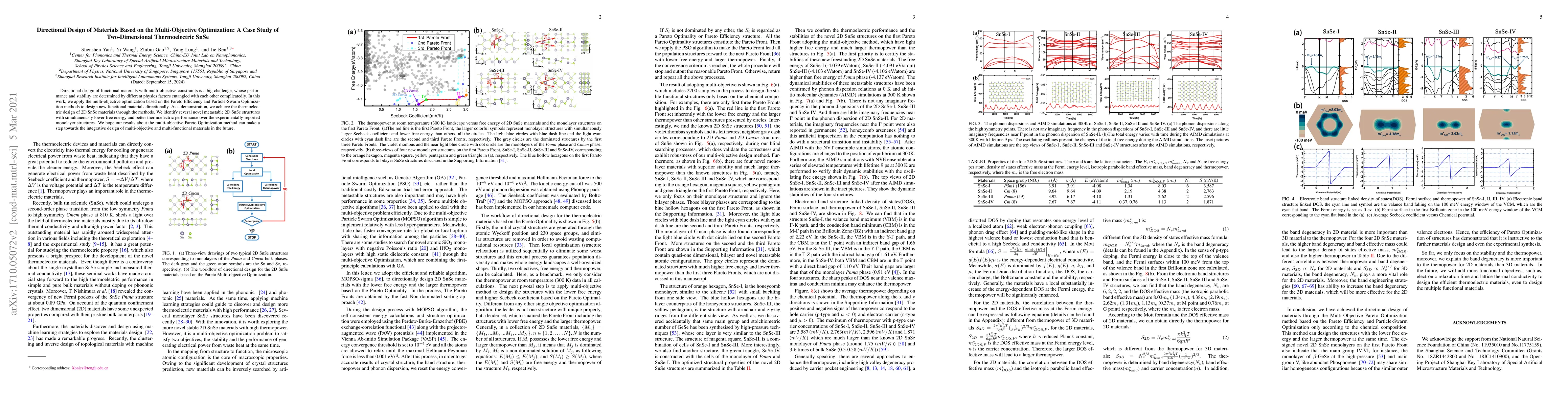 This paper employs multi-objective optimization techniques to design 2D thermoelectric SnSe materials, achieving novel metastable structures with improved performance and lower free energy compared to existing monolayer structures. The study aims to advance the integrative design of multifunctional materials through Pareto Efficiency and Particle-Swarm Optimization.