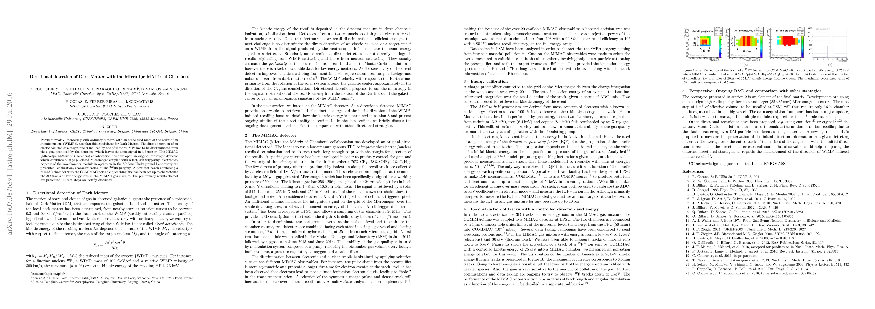 Particles weakly interacting with ordinary matter, with an associated mass of the order of an atomic nucleus (WIMPs), are plausible candidates for Dark Matter. The direct detection of an elastic collision of a target nuclei induced by one of these WIMPs has to be discriminated from the signal produced by the neutrons, which leaves the same signal in a detector. The MIMAC (MIcro-tpc MAtrix of Chambers) collaboration has developed an original prototype detector which combines a large pixelated Micromegas coupled with a fast, self-triggering, electronics. Aspects of the two-chamber module in operation in the Modane Underground Laboratory are presented: calibration, characterization of the $^{222}$Rn progeny. A new test bench combining a MIMAC chamber with the COMIMAC portable quenching line has been set up to characterize the 3D tracks of low energy ions in the MIMAC gas mixture: the preliminary results thereof are presented. Future steps are briefly discussed.