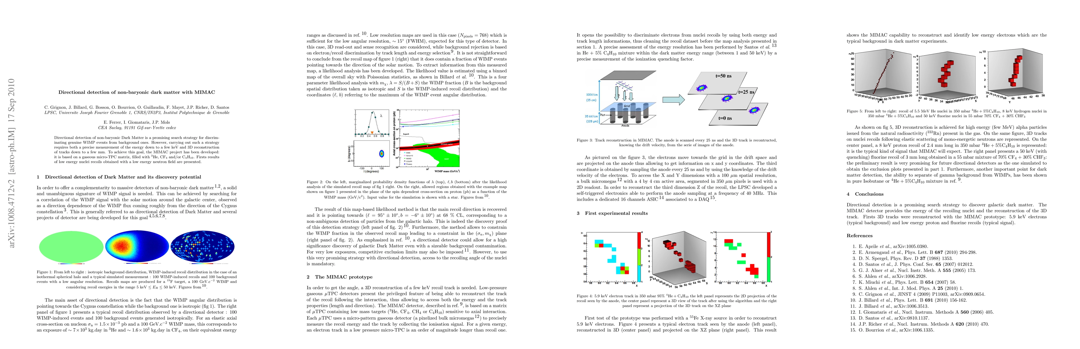 The MIMAC project aims to achieve directional detection of non-baryonic dark matter through precise energy measurements and 3D track reconstruction using a gaseous micro-TPC matrix. Initial results demonstrate successful low-energy nuclei recoil detection using a neutron field.
