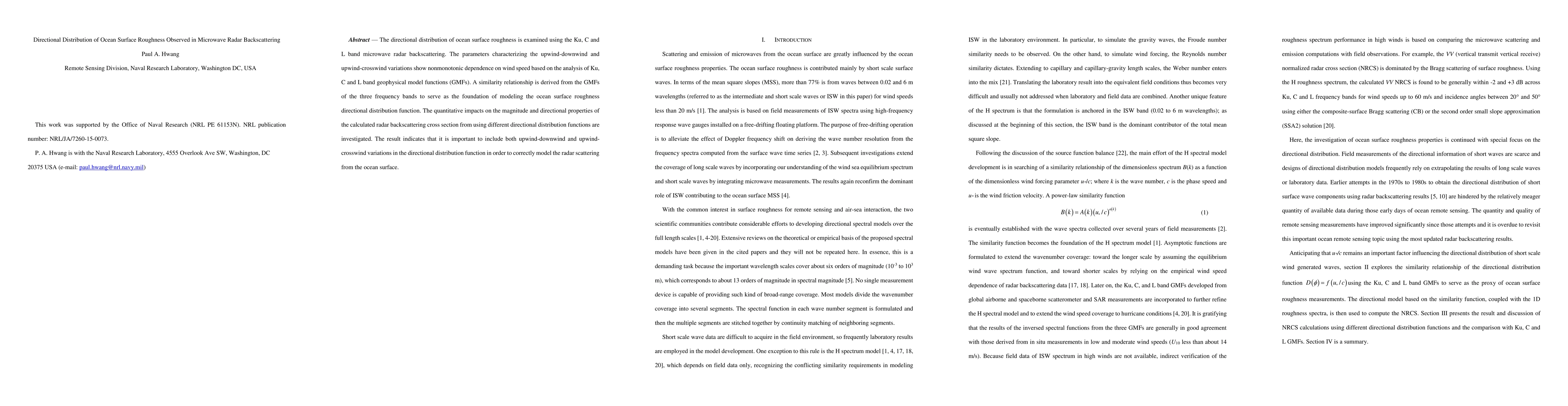 This study investigates the directional distribution of ocean surface roughness using Ku, C, and L band microwave radar backscattering, revealing nonmonotonic wind speed dependencies. A similarity relationship derived from these bands' geophysical model functions forms the basis for modeling the ocean surface roughness, highlighting the importance of including upwind-downwind and upwind-crosswind variations for accurate radar scattering modeling.