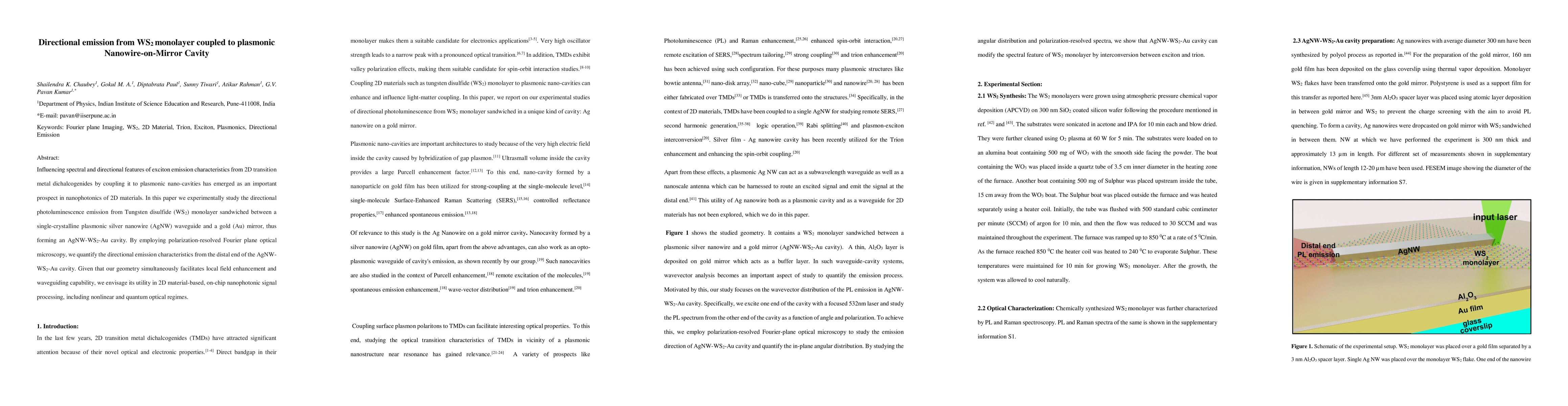 This paper investigates the directional emission of photoluminescence from a WS2 monolayer coupled to a plasmonic nanowire-on-mirror cavity, demonstrating significant spectral and directional control via polarization-resolved microscopy. The proposed AgNW-WS2-Au cavity geometry shows potential for on-chip nanophotonic signal processing in 2D materials.