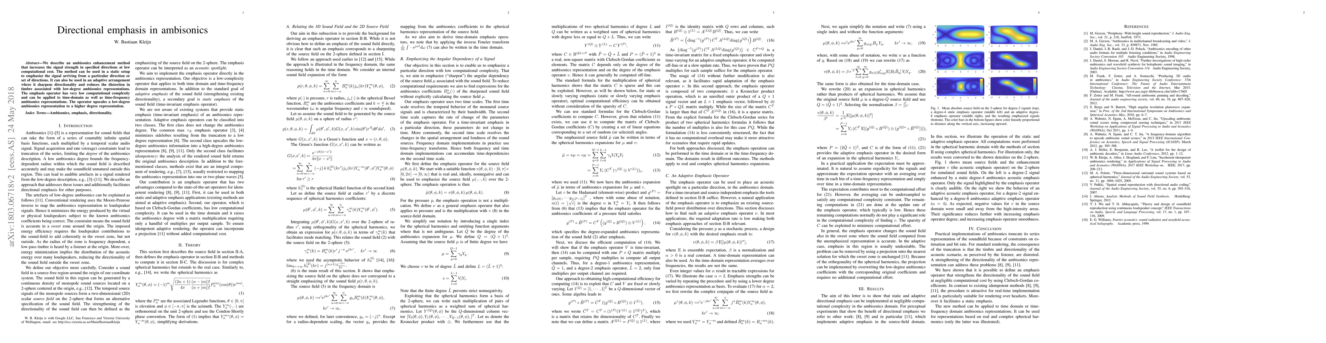 The research describes an ambisonics enhancement method that increases signal strength in specified directions with low computational cost. It involves an emphasis operator that can be applied to both time-domain and time-frequency ambisonics representations, upscaling a low-degree representation to a higher degree.