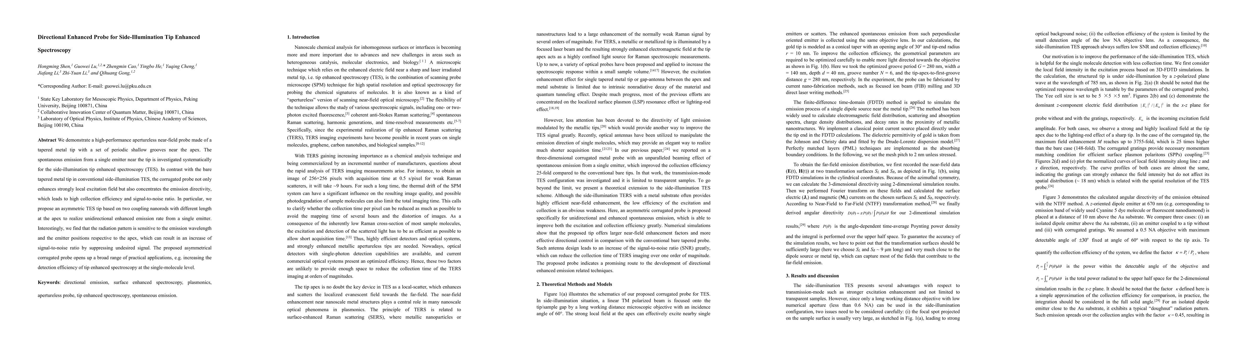 This paper presents a high-performance, asymmetric corrugated metal tip for side-illumination tip enhanced spectroscopy, which significantly enhances local excitation fields and directs emission, leading to improved signal-to-noise ratio and detection efficiency at the single-molecule level. The probe's radiation pattern is shown to be sensitive to emission wavelength and emitter position, enhancing practical applications.