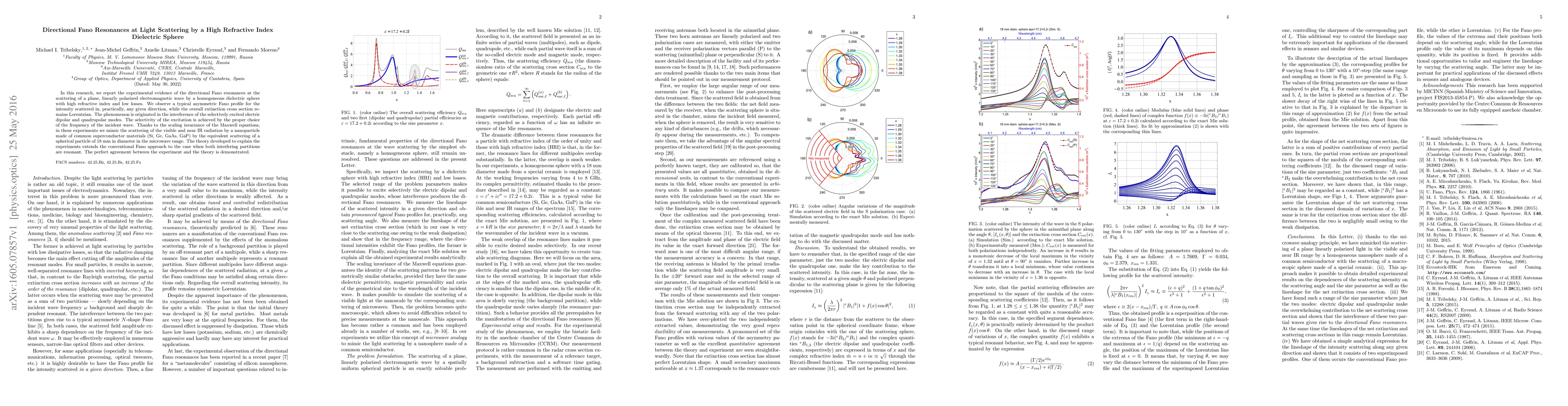 This research demonstrates directional Fano resonances in the light scattering by a high refractive index dielectric sphere, revealing an asymmetric scattering profile due to interference between selectively excited electric dipolar and quadrupolar modes. The theoretical model extends conventional Fano theory to dual resonant interference, matching experimental observations.