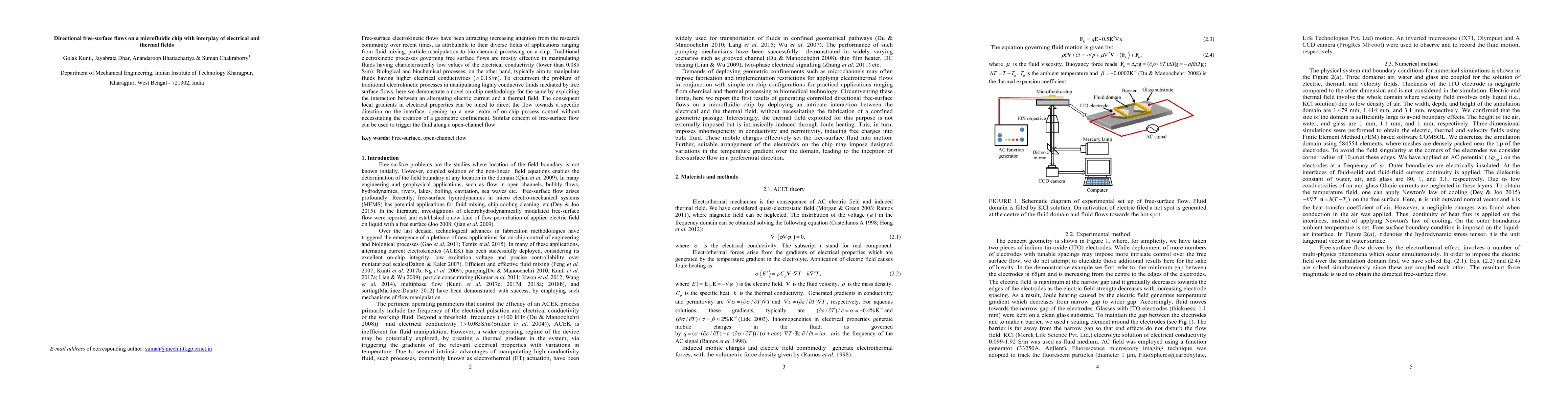 This paper presents a novel microfluidic chip methodology that leverages the interplay of alternating electric currents and thermal fields to control directional free-surface flows, enabling manipulation of highly conductive fluids without geometric confinement, thus expanding on-chip process control.