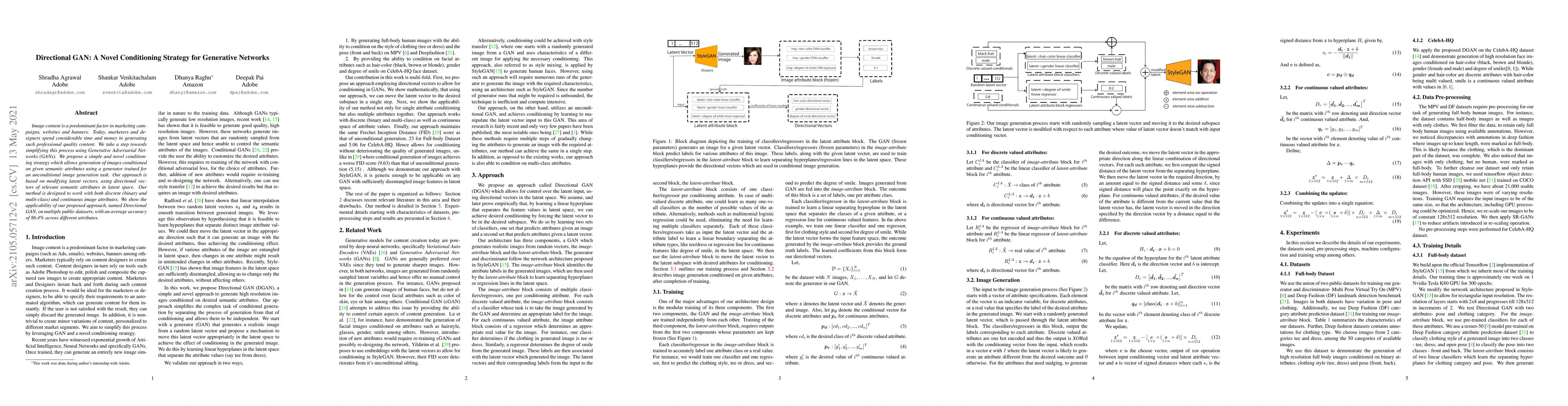 Image content is a predominant factor in marketing campaigns, websites and banners. Today, marketers and designers spend considerable time and money in generating such professional quality content. We take a step towards simplifying this process using Generative Adversarial Networks (GANs). We propose a simple and novel conditioning strategy which allows generation of images conditioned on given semantic attributes using a generator trained for an unconditional image generation task. Our approach is based on modifying latent vectors, using directional vectors of relevant semantic attributes in latent space. Our method is designed to work with both discrete (binary and multi-class) and continuous image attributes. We show the applicability of our proposed approach, named Directional GAN, on multiple public datasets, with an average accuracy of 86.4% across different attributes.