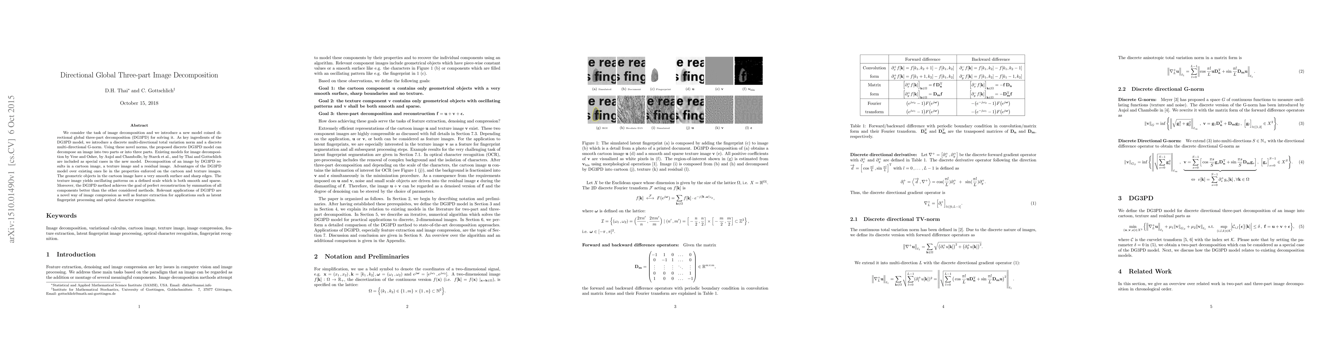 The Directional Global Three-part Image Decomposition (DG3PD) model decomposes an image into a cartoon image, texture image, and residual image, achieving perfect reconstruction and offering improved properties over existing models for image compression and feature extraction.