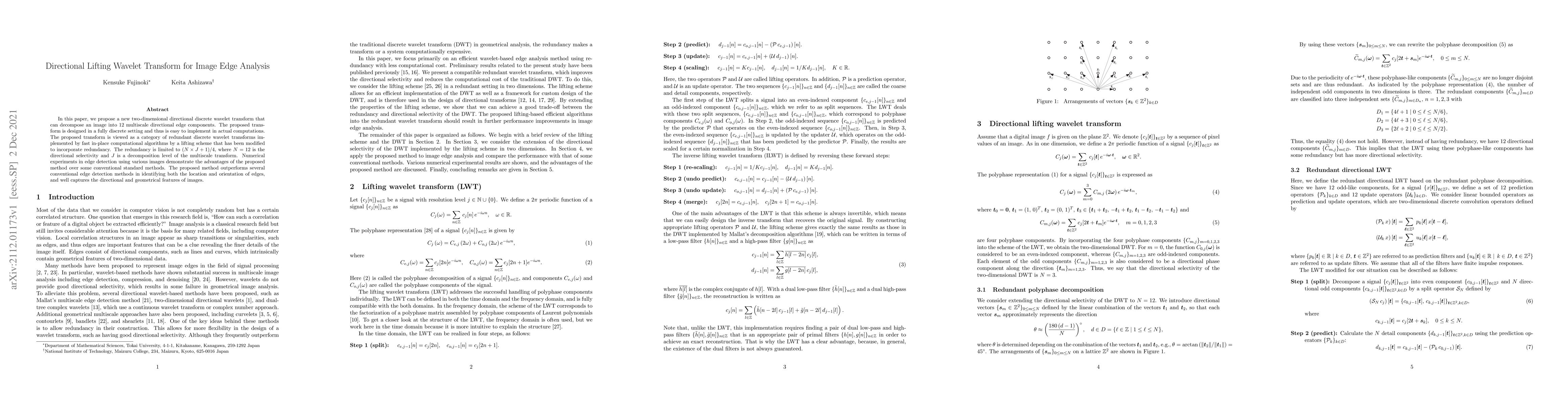 This paper introduces a new two-dimensional directional lifting wavelet transform that decomposes an image into 12 multiscale directional edge components, demonstrating superior edge detection performance over conventional methods. The transform is implemented efficiently using a modified lifting scheme and shows better identification of edge locations and orientations.