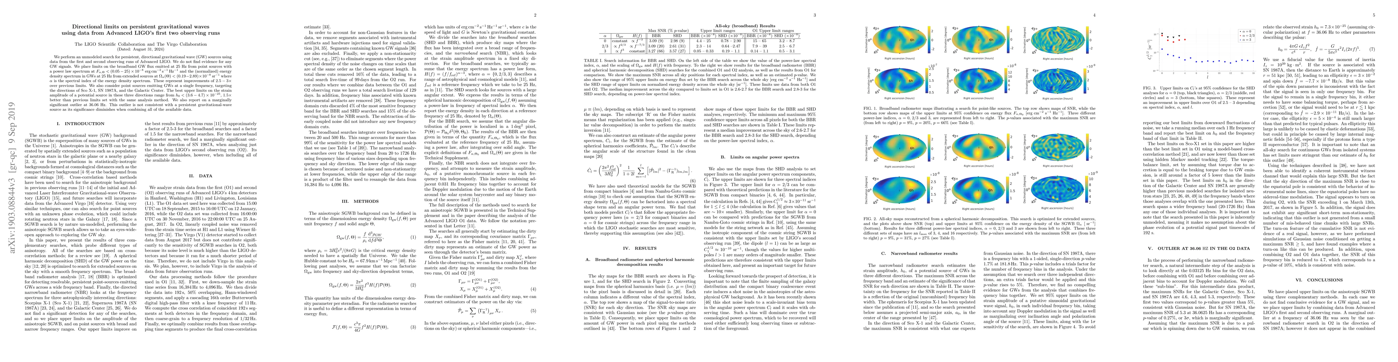 This study uses Advanced LIGO data from the first two observing runs to search for persistent, directional gravitational waves, finding no evidence of such signals. It sets new limits on the broadband gravitational wave flux and energy density spectrum, improving previous constraints by 2.5-3 times.