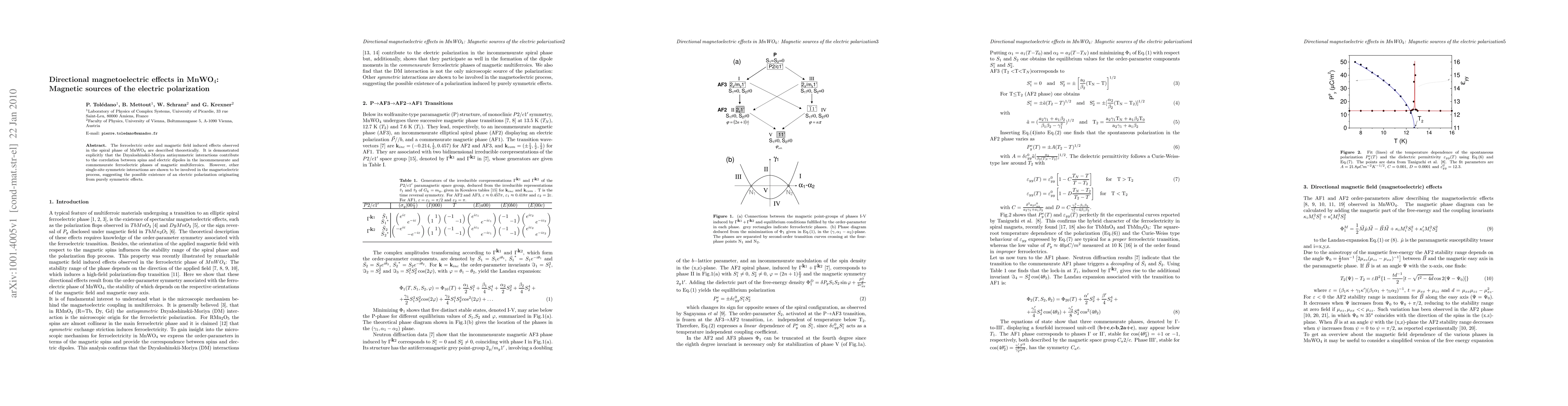 The ferroelectric order and magnetic field induced effects observed in the spiral phase of MnWO4 are described theoretically. It is demonstrated explicitly that the Dzyaloshinskii-Moriya antisymmetric interactions contribute to the correlation between spins and electric dipoles in the incommensurate and commensurate ferroelectric phases of magnetic multiferroics. However, other single-site symmetric interactions are shown to be involved in the magnetoelectric process, suggesting the possible existence of an electric polarization originating from purely symmetric effects.
