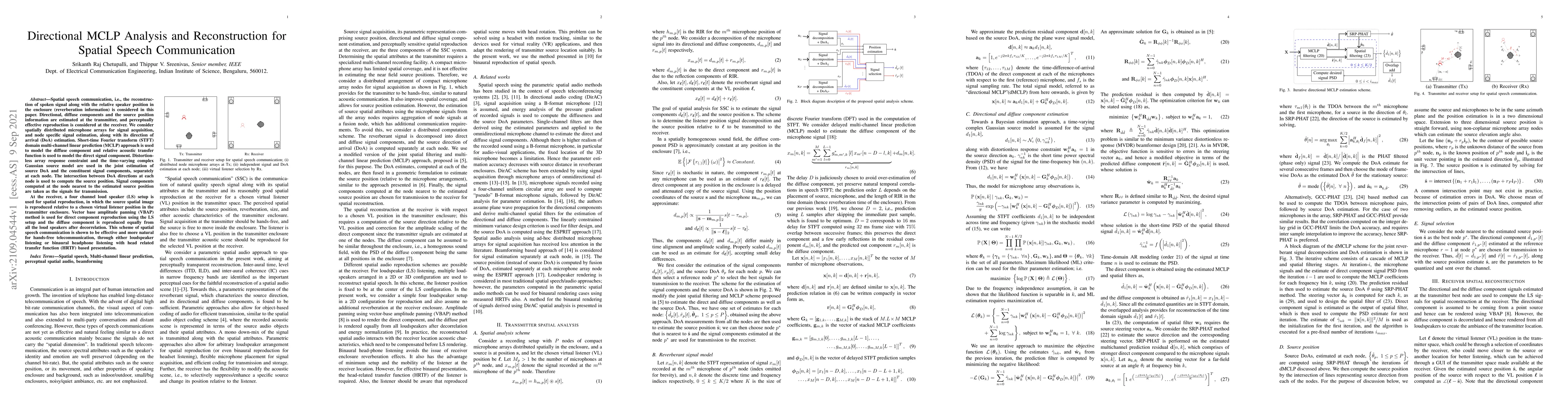 Spatial speech communication, i.e., the reconstruction of spoken signal along with the relative speaker position in the enclosure (reverberation information) is considered in this paper. Directional, diffuse components and the source position information are estimated at the transmitter, and perceptually effective reproduction is considered at the receiver. We consider spatially distributed microphone arrays for signal acquisition, and node specific signal estimation, along with its direction of arrival (DoA) estimation. Short-time Fourier transform (STFT) domain multi-channel linear prediction (MCLP) approach is used to model the diffuse component and relative acoustic transfer function is used to model the direct signal component. Distortion-less array response constraint and the time-varying complex Gaussian source model are used in the joint estimation of source DoA and the constituent signal components, separately at each node. The intersection between DoA directions at each node is used to compute the source position. Signal components computed at the node nearest to the estimated source position are taken as the signals for transmission. At the receiver, a four channel loud speaker (LS) setup is used for spatial reproduction, in which the source spatial image is reproduced relative to a chosen virtual listener position in the transmitter enclosure. Vector base amplitude panning (VBAP) method is used for direct component reproduction using the LS setup and the diffuse component is reproduced equally from all the loud speakers after decorrelation. This scheme of spatial speech communication is shown to be effective and more natural for hands-free telecommunication, through either loudspeaker listening or binaural headphone listening with head related transfer function (HRTF) based presentation.