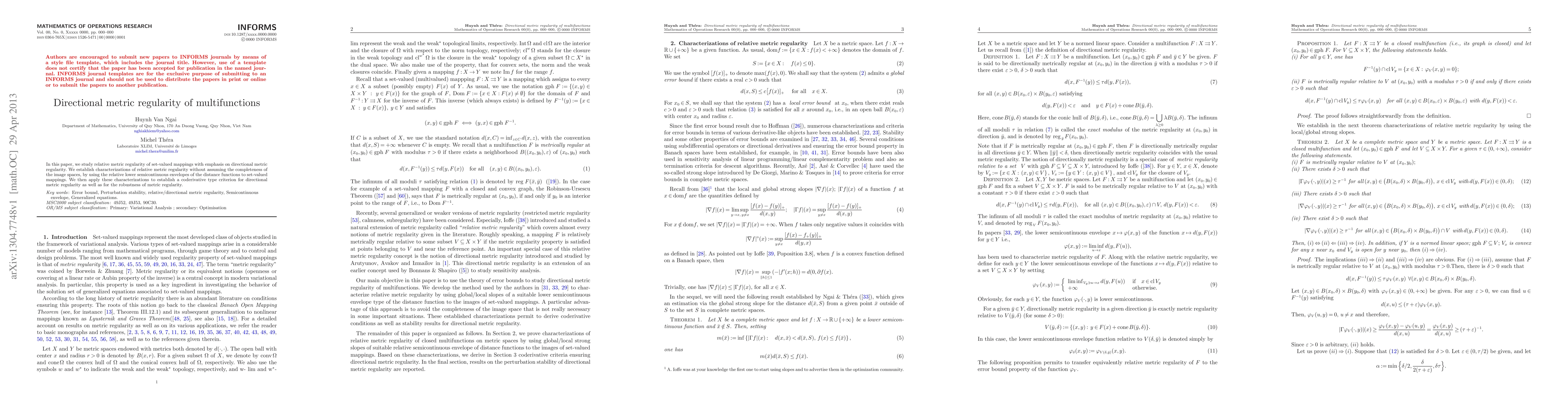 This paper investigates the relative metric regularity of set-valued mappings, focusing on directional metric regularity, and provides characterizations without requiring the completeness of the image spaces. The study also establishes a coderivative criterion for directional metric regularity and robustness.