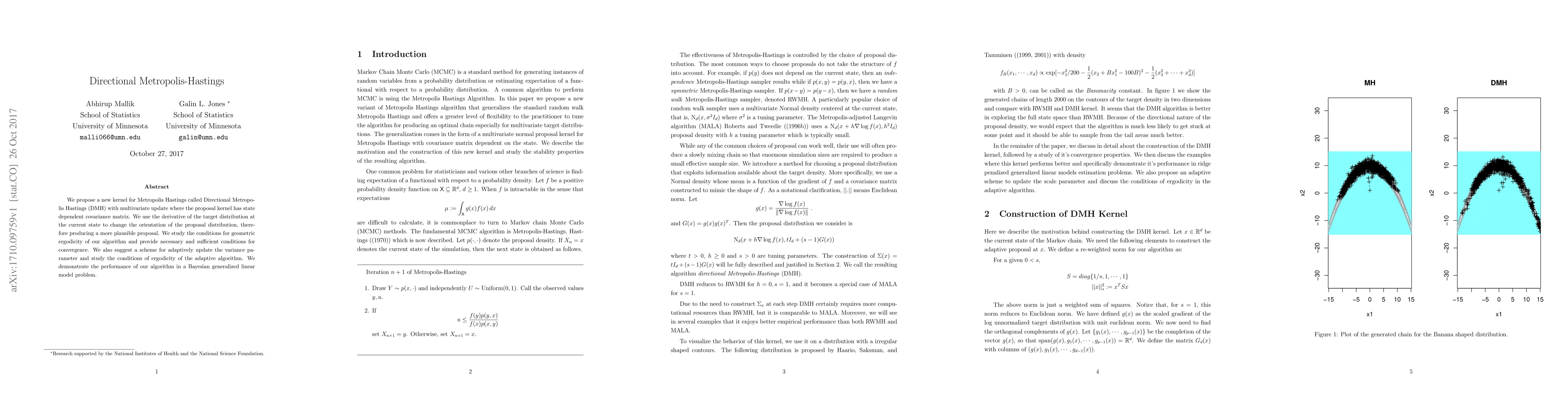 The paper introduces Directional Metropolis-Hastings (DMH), a new kernel for the Metropolis-Hastings algorithm with a multivariate update and state-dependent covariance matrix, which reorients the proposal distribution using the target distribution's derivative. The authors provide conditions for geometric ergodicity and suggest an adaptive variance update scheme, demonstrating its effectiveness in a Bayesian generalized linear model.