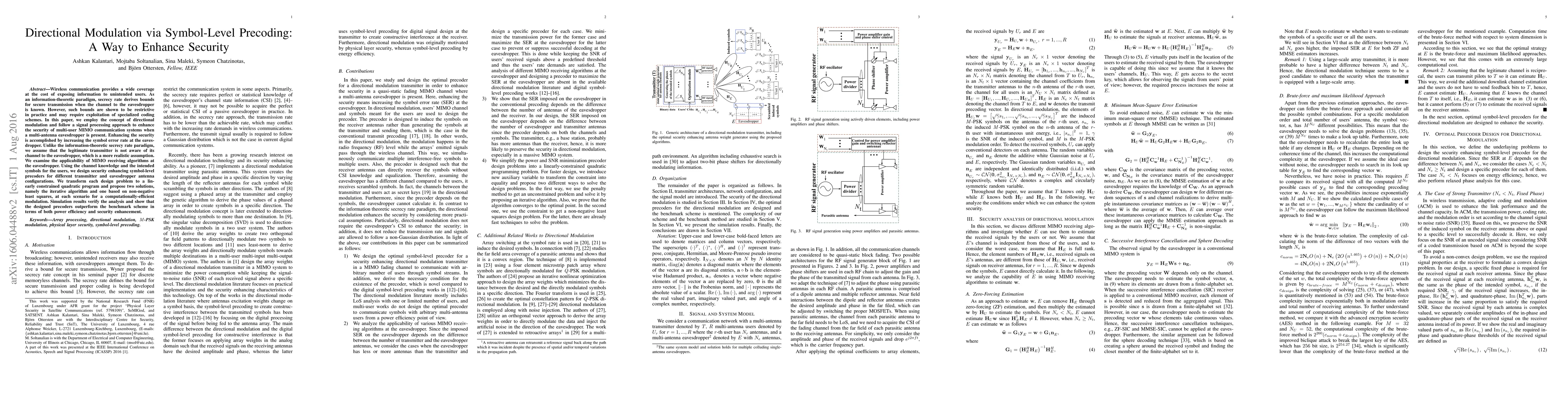 Wireless communication provides a wide coverage at the cost of exposing information to unintended users. As an information-theoretic paradigm, secrecy rate derives bounds for secure transmission when the channel to the eavesdropper is known. However, such bounds are shown to be restrictive in practice and may require exploitation of specialized coding schemes. In this paper, we employ the concept of directional modulation and follow a signal processing approach to enhance the security of multi-user MIMO communication systems when a multi-antenna eavesdropper is present. Enhancing the security is accomplished by increasing the symbol error rate at the eavesdropper. Unlike the information-theoretic secrecy rate paradigm, we assume that the legitimate transmitter is not aware of its channel to the eavesdropper, which is a more realistic assumption. We examine the applicability of MIMO receiving algorithms at the eavesdropper. Using the channel knowledge and the intended symbols for the users, we design security enhancing symbol-level precoders for different transmitter and eavesdropper antenna configurations. We transform each design problem to a linearly constrained quadratic program and propose two solutions, namely the iterative algorithm and one based on non-negative least squares, at each scenario for a computationally-efficient modulation. Simulation results verify the analysis and show that the designed precoders outperform the benchmark scheme in terms of both power efficiency and security enhancement.