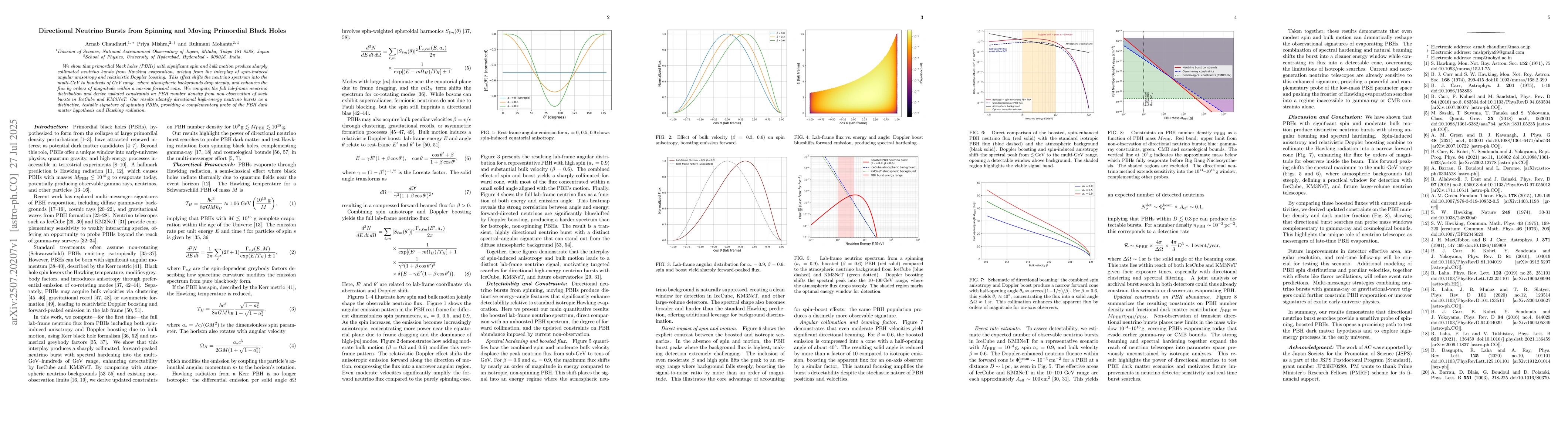 The paper demonstrates that spinning and moving primordial black holes emit sharply collimated, high-energy neutrino bursts due to spin-induced angular anisotropy and relativistic Doppler boosting. These bursts, potentially observable in the multi-GeV to hundreds of GeV range, could serve as a distinct signature for primordial black hole dark matter, providing new constraints from IceCube and KM3NeT data.