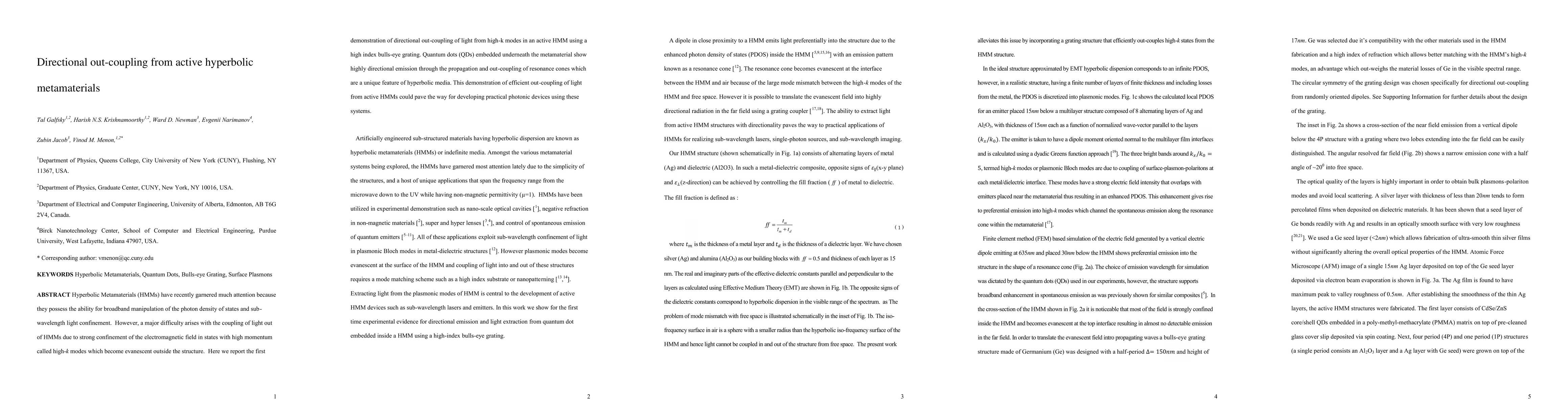 This paper demonstrates directional out-coupling of light from high-k modes in active hyperbolic metamaterials using a high-index bulls-eye grating, facilitated by embedded quantum dots, which could enable the development of practical photonic devices.