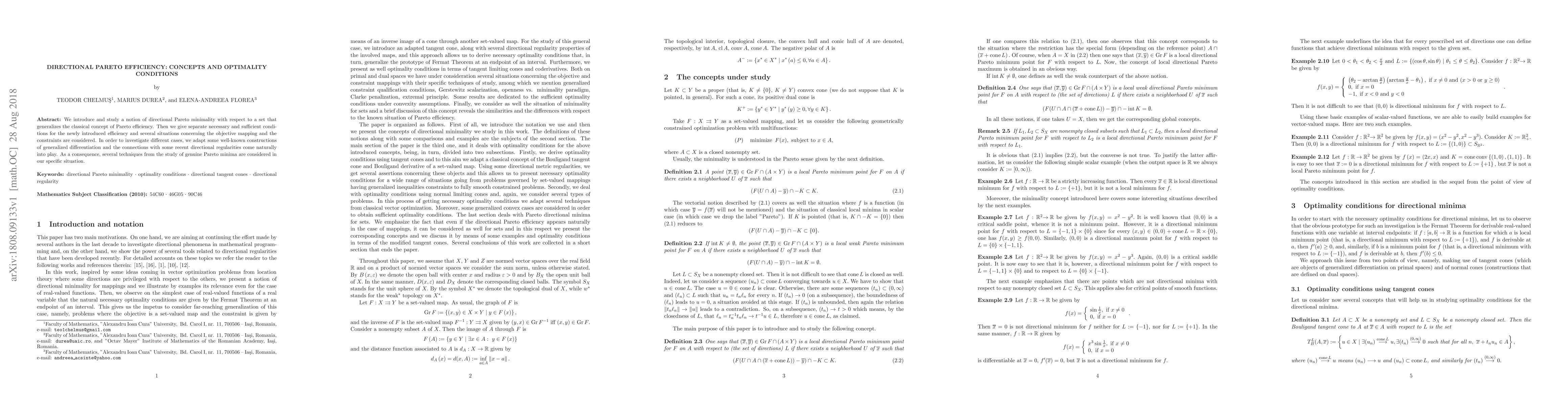 This paper introduces a new concept of directional Pareto efficiency, providing necessary and sufficient conditions for its optimality. It explores various scenarios involving objective mappings and constraints, utilizing generalized differentiation and recent directional regularities.
