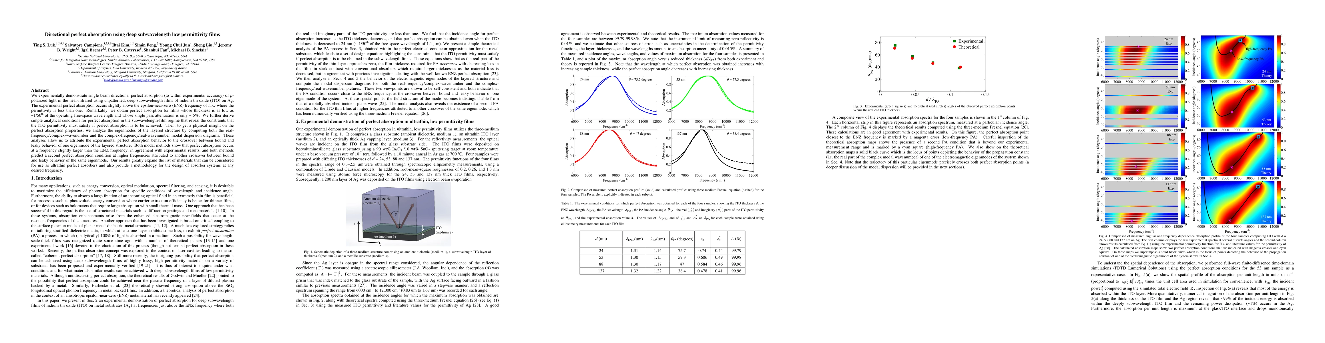 Researchers demonstrate directional perfect absorption of near-infrared light using ultra-thin indium tin oxide films on silver, achieving near-perfect absorption at frequencies slightly above the epsilon-near-zero frequency with minimal loss.