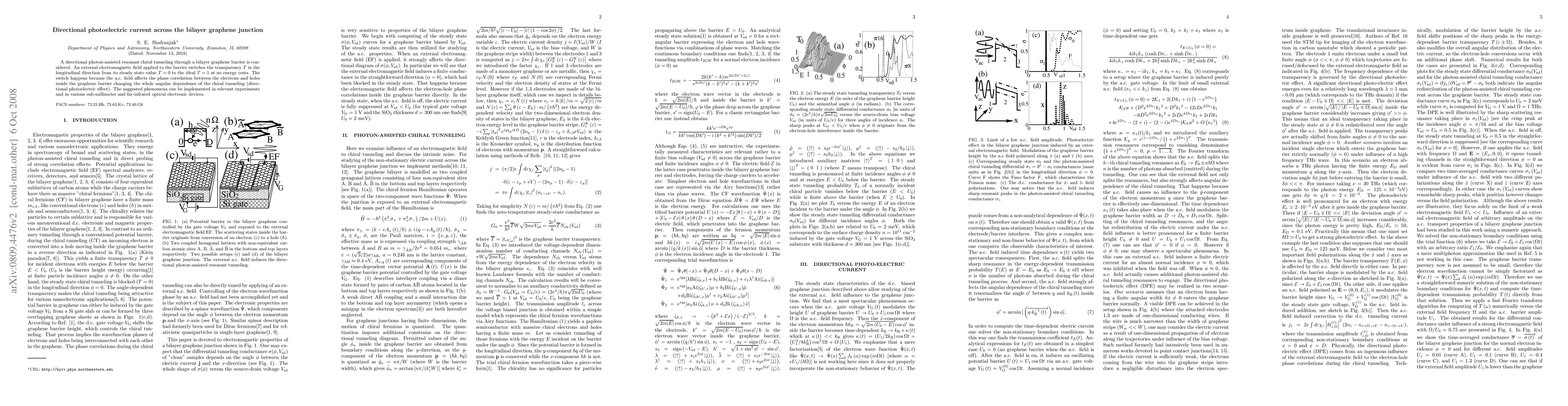A directional photon-assisted resonant chiral tunneling through a bilayer graphene barrier is considered. An external electromagnetic field applied to the barrier switches the transparency $T$ in the longitudinal direction from its steady state value T=0 to the ideal T=1 at no energy costs. The switch happens because the a.c. field affects the phase correlation between the electrons and holes inside the graphene barrier changing the whole angular dependence of the chiral tunneling (directional photoelectric effect). The suggested phenomena can be implemented in relevant experiments and in various sub-millimeter and far-infrared optical electronic devices.