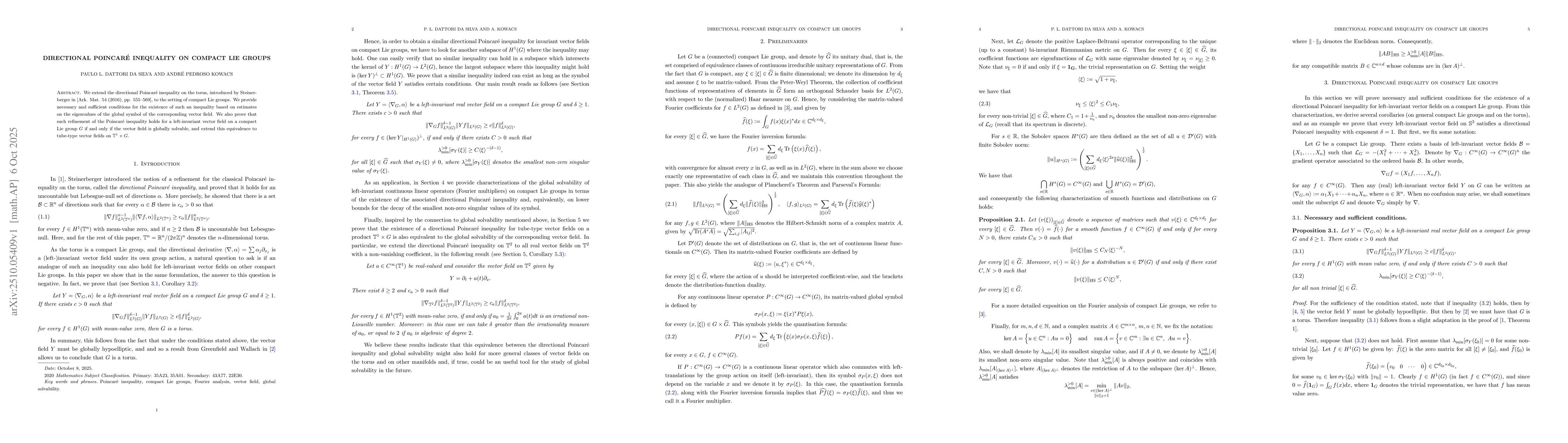 The research employs a combination of functional analysis, harmonic analysis on Lie groups, and spectral theory to study directional Poincaré inequalities and global hypoellipticity for vector fields on compact Lie groups and tori. It leverages Fourier analysis on compact Lie groups, tridiagonal matrix eigenvalue analysis, and Diophantine approximation techniques.