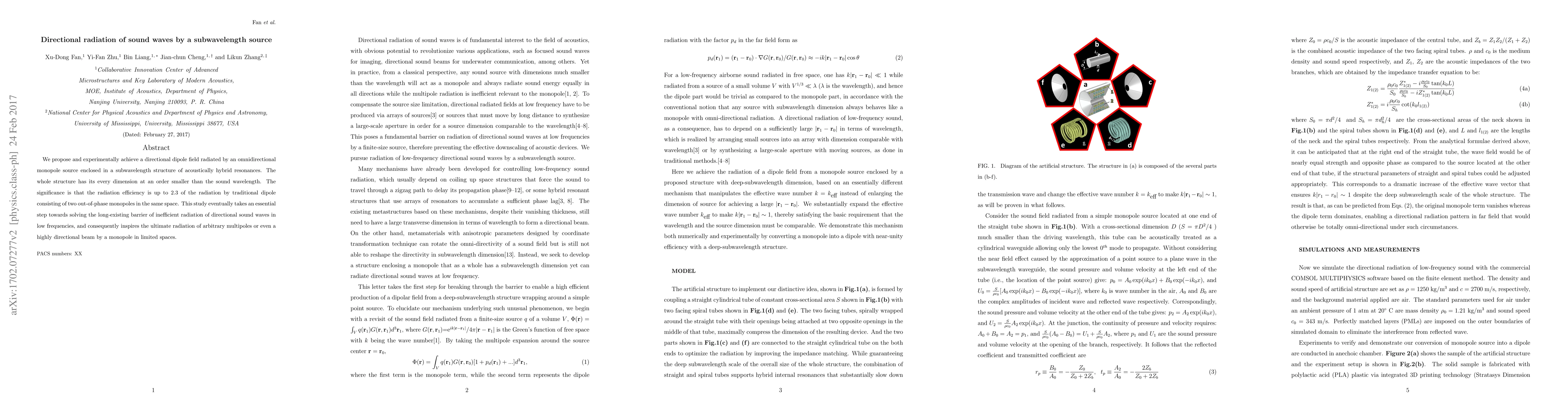 This paper proposes a subwavelength structure that enables directional sound radiation from an omnidirectional monopole source, achieving up to 2.3 times the efficiency of traditional dipole radiation. This breakthrough addresses the longstanding challenge of directional sound radiation in low frequencies and paves the way for advanced directional sound beam control.