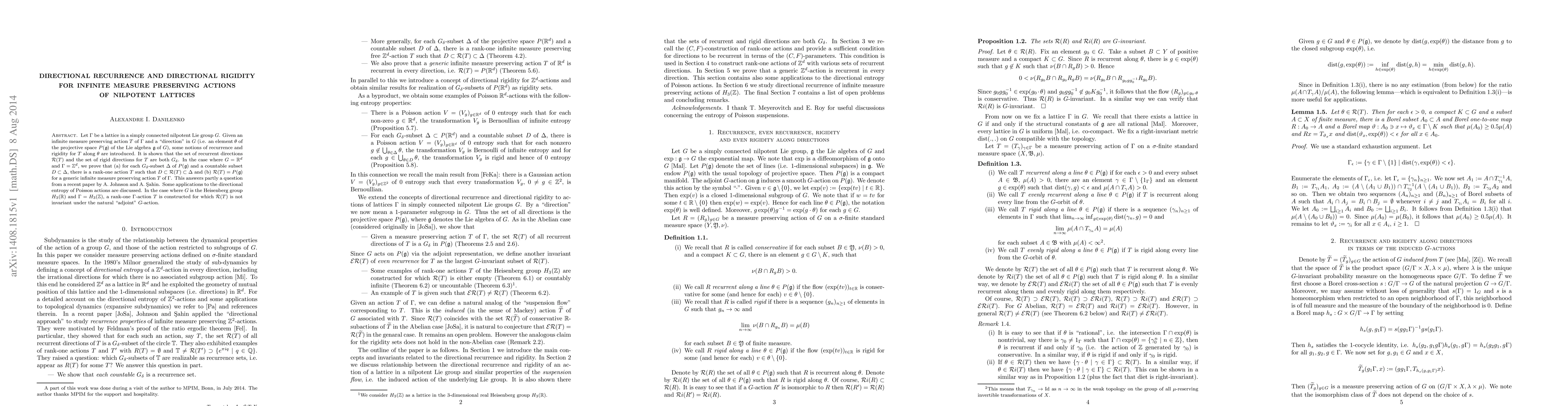 Let $\Gamma$ be a lattice in a simply connected nilpotent Lie group $G$. Given an infinite measure preserving action $T$ of $\Gamma$ and a "direction" in $G$ (i.e. an element $\theta$ of the projective space $P(\goth g)$ of the Lie algebra $\goth g$ of $G$), some notions of recurrence and rigidity for $T$ along $\theta$ are introduced. It is shown that the set of recurrent directions $\Cal R(T)$ and the set of rigid directions for $T$ are both $G_\delta$. In the case where $G=\Bbb R^d$ and $\Gamma=\Bbb Z^d$, we prove that (a) for each $G_\delta$-subset $\Delta$ of $P(\goth g)$ and a countable subset $D\subset\Delta$, there is a rank-one action $T$ such that $D\subset\Cal R(T)\subset\Delta$ and (b) $\Cal R(T)=P(\goth g)$ for a generic infinite measure preserving action $T$ of $\Gamma$. This answers partly a question from a recent paper by A.~Johnson and A.~{\c S}ahin. Some applications to the directional entropy of Poisson actions are discussed. In the case where $G$ is the Heisenberg group $H_3(\Bbb R)$ and $\Gamma=H_3(\Bbb Z)$, a rank-one $\Gamma$-action $T$ is constructed for which $\Cal R(T)$ is not invariant under the natural "adjoint" $G$-action.
