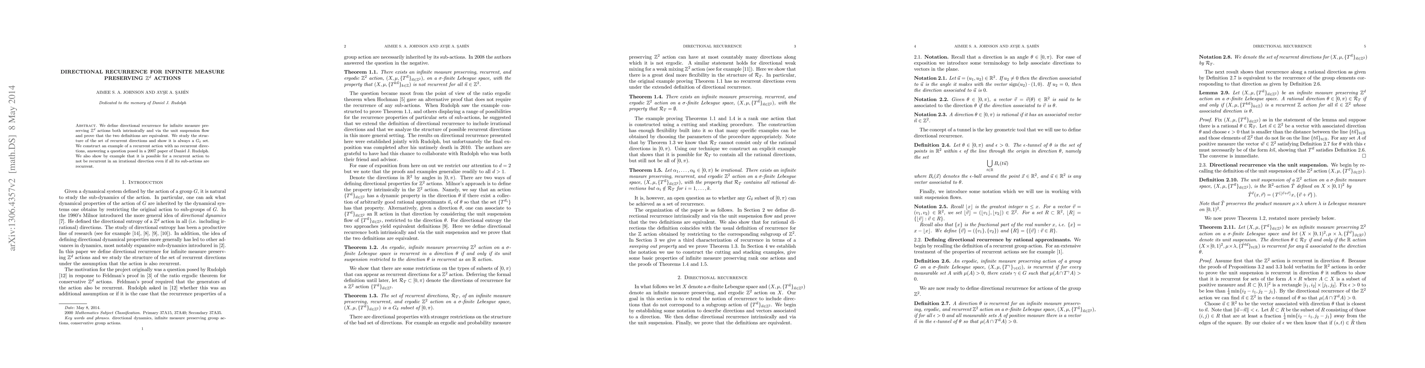 This paper defines and proves the equivalence of intrinsic and flow-based definitions of directional recurrence for infinite measure preserving Z^d actions. It demonstrates that the set of recurrent directions is always a G_delta set and provides an example of a recurrent action lacking recurrent directions, addressing a question from a 2007 paper.