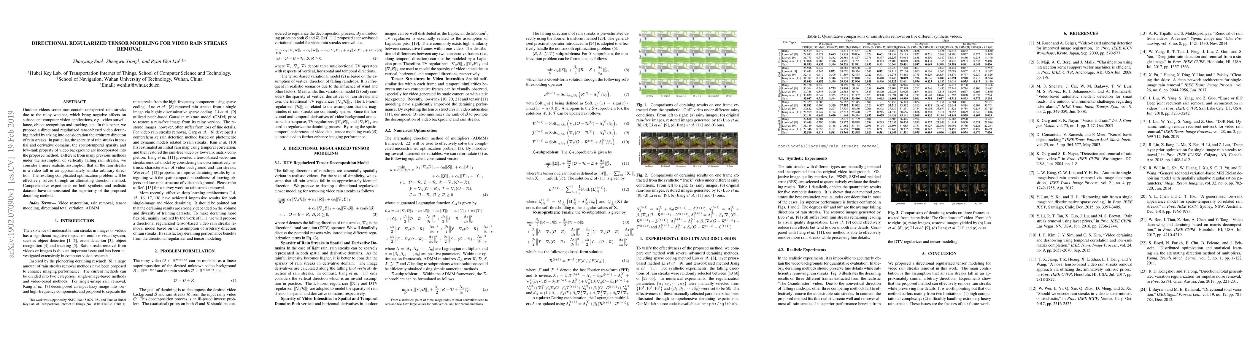 This paper proposes a directional regularized tensor model for removing rain streaks from outdoor videos, considering the arbitrary direction of rain streaks. The method incorporates spatial and derivative sparsity, spatiotemporal sparsity, and low-rank properties of video backgrounds, and outperforms previous methods through comprehensive experiments.