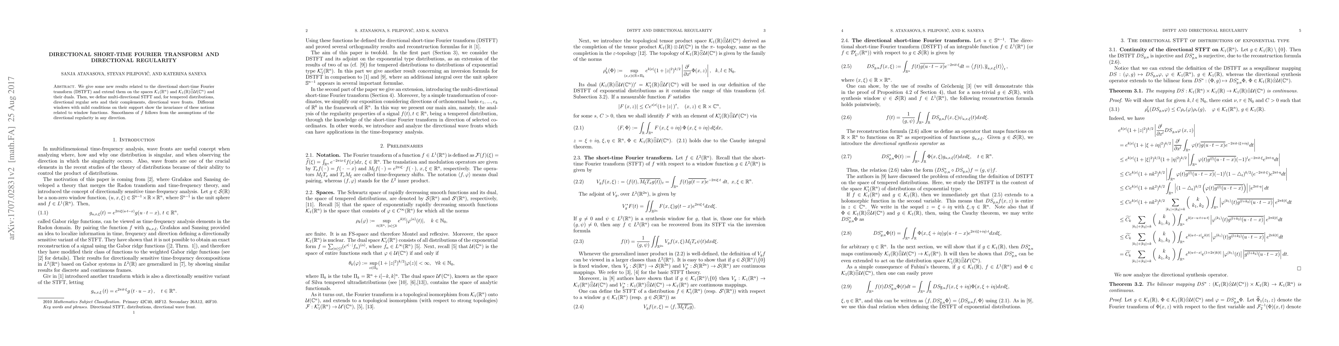 This paper introduces new results on the directional short-time Fourier transform (DSTFT) and extends them to specific function spaces. It defines multi-directional STFT and discusses directional regularity, wave fronts, and the invariance under different windows, concluding that directional regularity implies smoothness.