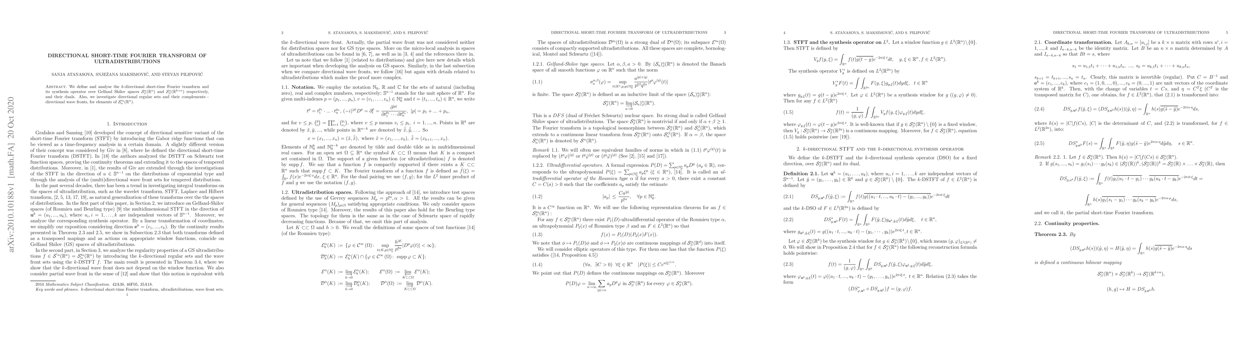 The paper defines and analyzes the $k$-directional short-time Fourier transform for ultradistributions within Gelfand Shilov spaces, focusing on synthesis operators and their duals, and examines directional regular sets and wave fronts for elements in these spaces.