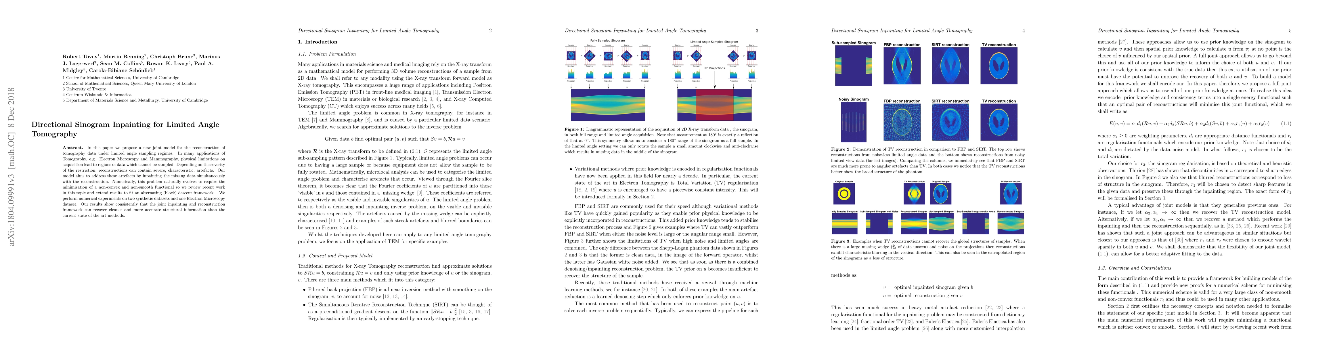 In this paper we propose a new joint model for the reconstruction of tomography data under limited angle sampling regimes. In many applications of Tomography, e.g. Electron Microscopy and Mammography, physical limitations on acquisition lead to regions of data which cannot be sampled. Depending on the severity of the restriction, reconstructions can contain severe, characteristic, artefacts. Our model aims to address these artefacts by inpainting the missing data simultaneously with the reconstruction. Numerically, this problem naturally evolves to require the minimisation of a non-convex and non-smooth functional so we review recent work in this topic and extend results to fit an alternating (block) descent framework. We illustrate the effectiveness of this approach with numerical experiments on two synthetic datasets and one Electron Microscopy dataset.