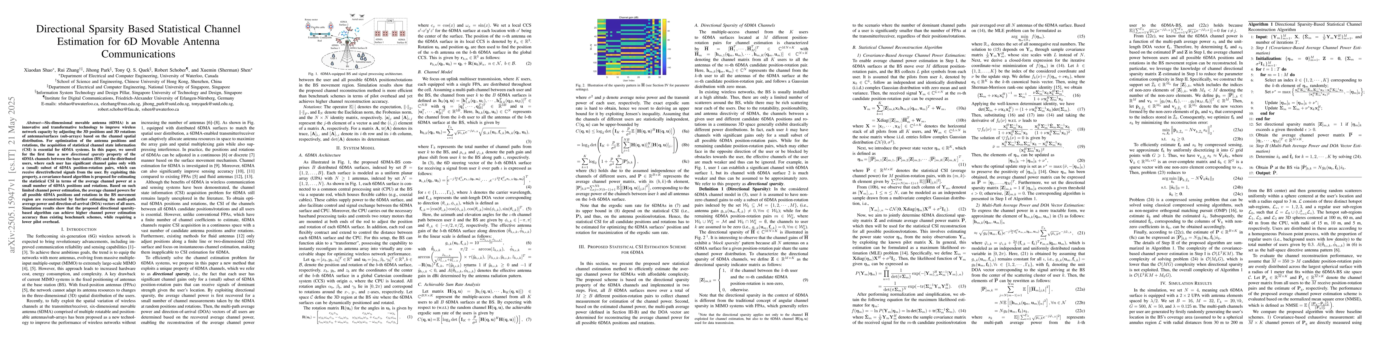 The introduction of directional sparsity property and the development of a covariance-based statistical CSI estimation algorithm for 6DMA systems.