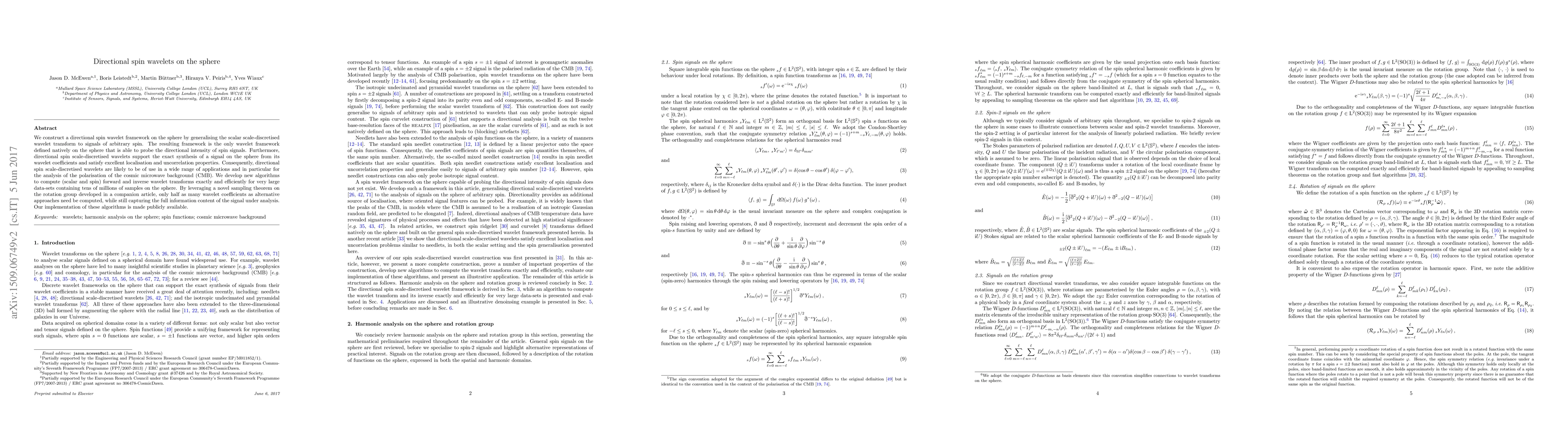 The paper constructs a directional spin wavelet framework on the sphere, generalizing the scalar scale-discretised wavelet transform for arbitrary spin signals, enabling the analysis of directional intensity of spin signals natively on the sphere.