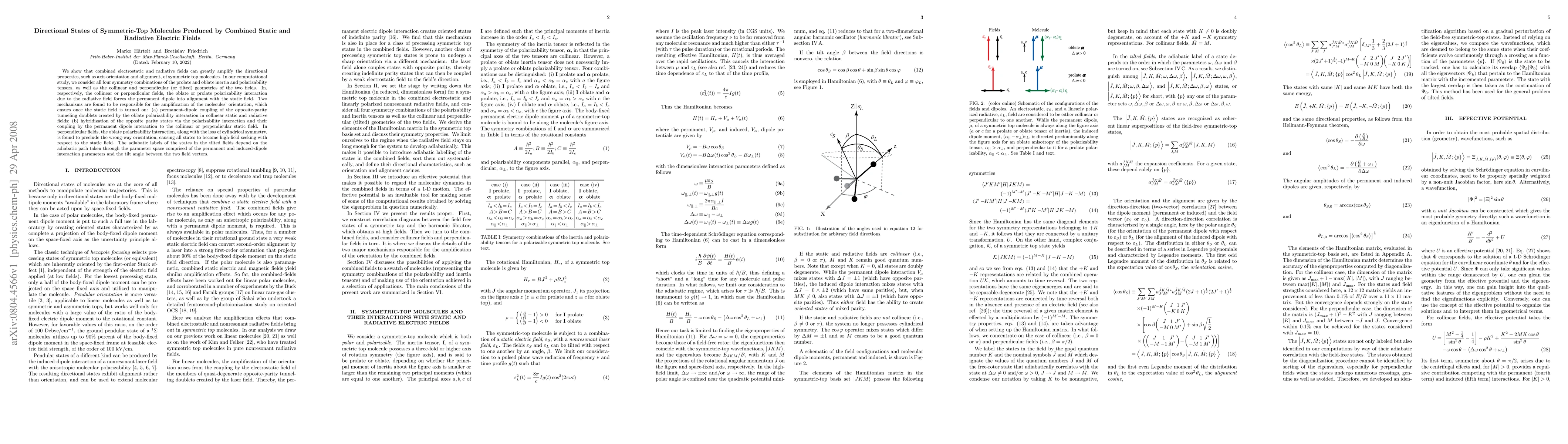 We show that combined electrostatic and radiative fields can greatly amplify the directional properties, such as axis orientation and alignment, of symmetric top molecules. In our computational study, we consider all four symmetry combinations of the prolate and oblate inertia and polarizability tensors, as well as the collinear and perpendicular (or tilted) geometries of the two fields. In, respectively, the collinear or perpendicular fields, the oblate or prolate polarizability interaction due to the radiative field forces the permanent dipole into alignment with the static field. Two mechanisms are found to be responsible for the amplification of the molecules' orientation, which ensues once the static field is turned on: (a) permanent-dipole coupling of the opposite-parity tunneling doublets created by the oblate polarizability interaction in collinear static and radiative fields; (b) hybridization of the opposite parity states via the polarizability interaction and their coupling by the permanent dipole interaction to the collinear or perpendicular static field. In perpendicular fields, the oblate polarizability interaction, along with the loss of cylindrical symmetry, is found to preclude the wrong-way orientation, causing all states to become high-field seeking with respect to the static field. The adiabatic labels of the states in the tilted fields depend on the adiabatic path taken through the parameter space comprised of the permanent and induced-dipole interaction parameters and the tilt angle between the two field vectors.