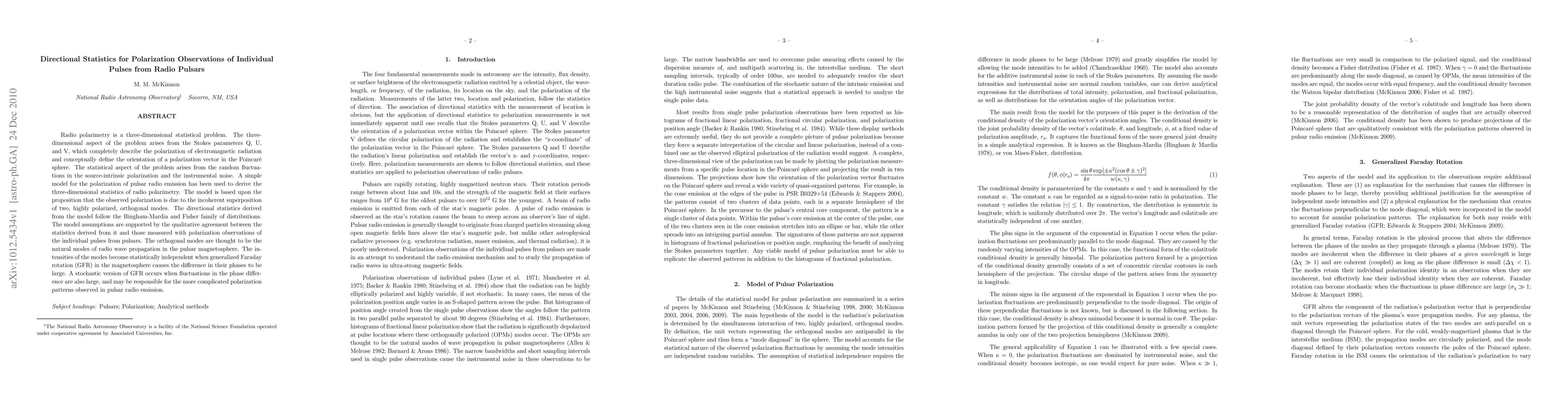 Radio polarimetry is a three-dimensional statistical problem. The three-dimensional aspect of the problem arises from the Stokes parameters Q, U, and V, which completely describe the polarization of electromagnetic radiation and conceptually define the orientation of a polarization vector in the Poincar'e sphere. The statistical aspect of the problem arises from the random fluctuations in the source-intrinsic polarization and the instrumental noise. A simple model for the polarization of pulsar radio emission has been used to derive the three-dimensional statistics of radio polarimetry. The model is based upon the proposition that the observed polarization is due to the incoherent superposition of two, highly polarized, orthogonal modes. The directional statistics derived from the model follow the Bingham-Mardia and Fisher family of distributions. The model assumptions are supported by the qualitative agreement between the statistics derived from it and those measured with polarization observations of the individual pulses from pulsars. The orthogonal modes are thought to be the natural modes of radio wave propagation in the pulsar magnetosphere. The intensities of the modes become statistically independent when generalized Faraday rotation (GFR) in the magnetosphere causes the difference in their phases to be large. A stochastic version of GFR occurs when fluctuations in the phase difference are also large, and may be responsible for the more complicated polarization patterns observed in pulsar radio emission.