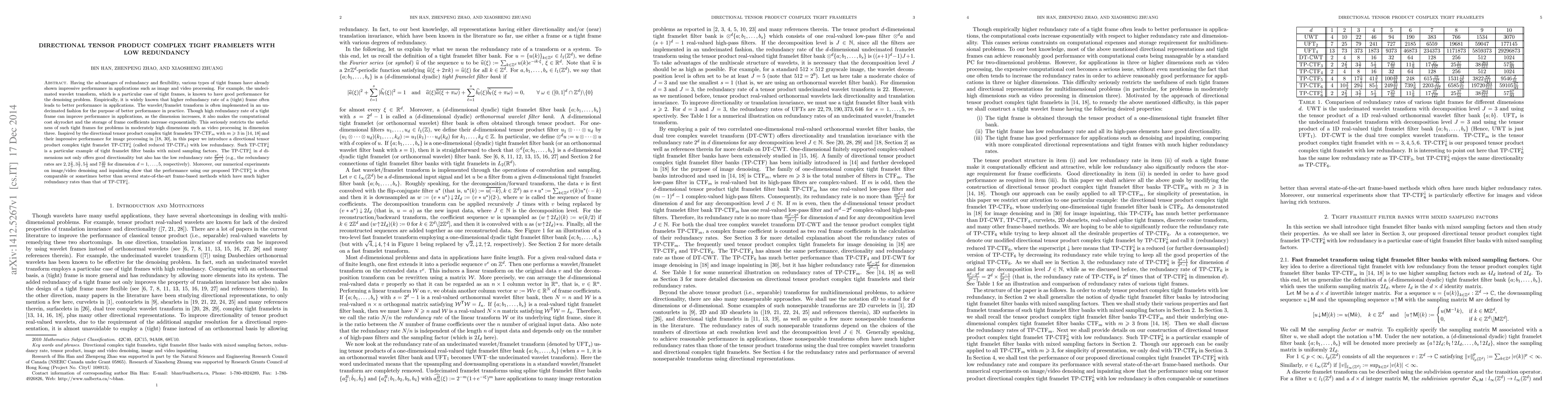 This paper introduces a directional tensor product complex tight framelet ${TP-CTF}^!_6$ with low redundancy, offering good directionality and reduced redundancy rates in multiple dimensions compared to traditional methods. The proposed ${TP-CTF}^!_6$ demonstrates competitive performance in image/video denoising and inpainting tasks, despite its lower redundancy.