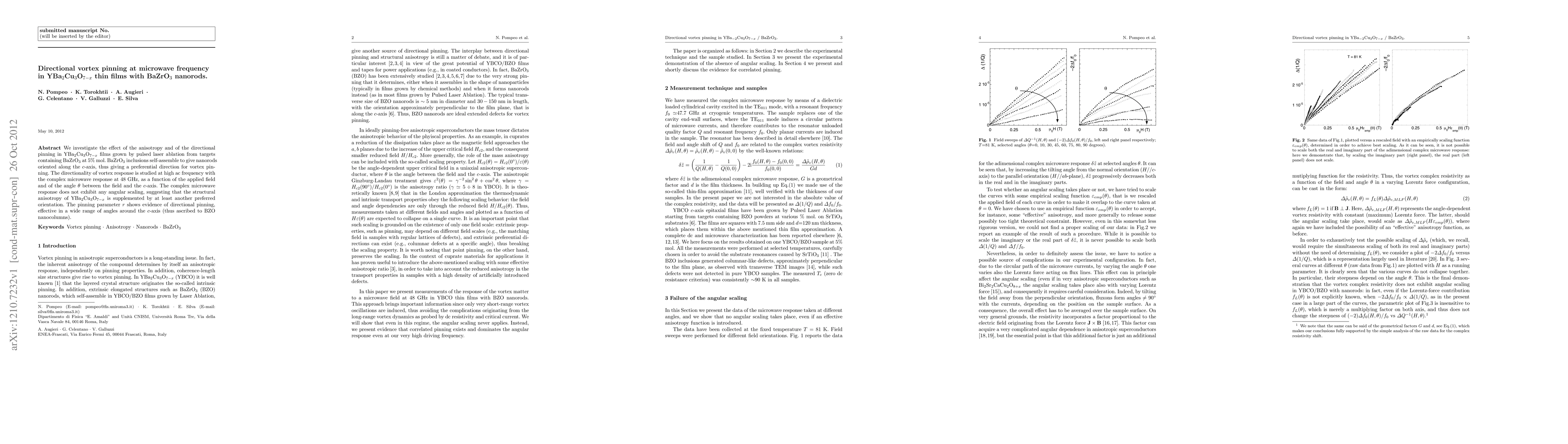 We investigate the effect of the anisotropy and of the directional pinning in YBa$_2$Cu$_3$O$_{7-x}$ films grown by pulsed laser ablation from targets containing BaZrO$_3$ at 5% mol. BaZrO$_3$ inclusions self-assemble to give nanorods oriented along the c-axis, thus giving a preferential direction for vortex pinning. The directionality of vortex response is studied at high ac frequency with the complex microwave response at 48 GHz, as a function of the applied field and of the angle $\theta$ between the field and the c-axis. The complex microwave response does not exhibit any angular scaling, suggesting that the structural anisotropy of YBa$_2$Cu$_3$O$_{7-x}$ is supplemented by at least another preferred orientation. The pinning parameter $r$ shows evidence of directional pinning, effective in a wide range of angles around the c-axis (thus ascribed to BZO nanocolumns).