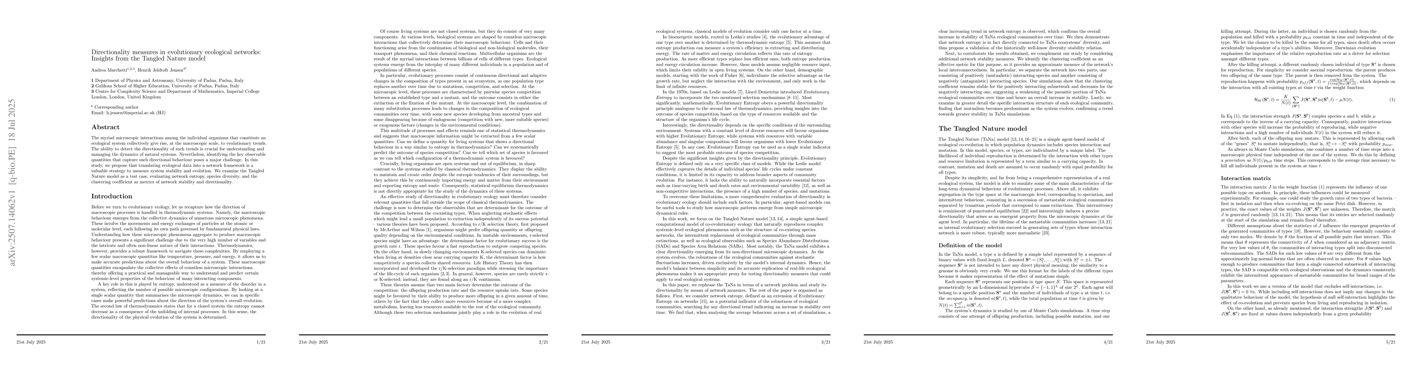 The myriad microscopic interactions among the individual organisms that constitute an ecological system collectively give rise, at the macroscopic scale, to evolutionary trends. The ability to detect the directionality of such trends is crucial for understanding and managing the dynamics of natural systems. Nevertheless, identifying the key observable quantities that capture such directional behaviour poses a major challenge. In this study, we propose that translating ecological data into a network framework is a valuable strategy to measure system stability and evolution. We examine the Tangled Nature model as a test case, evaluating network entropy, species diversity, and the clustering coefficient as metrics of network stability and directionality.