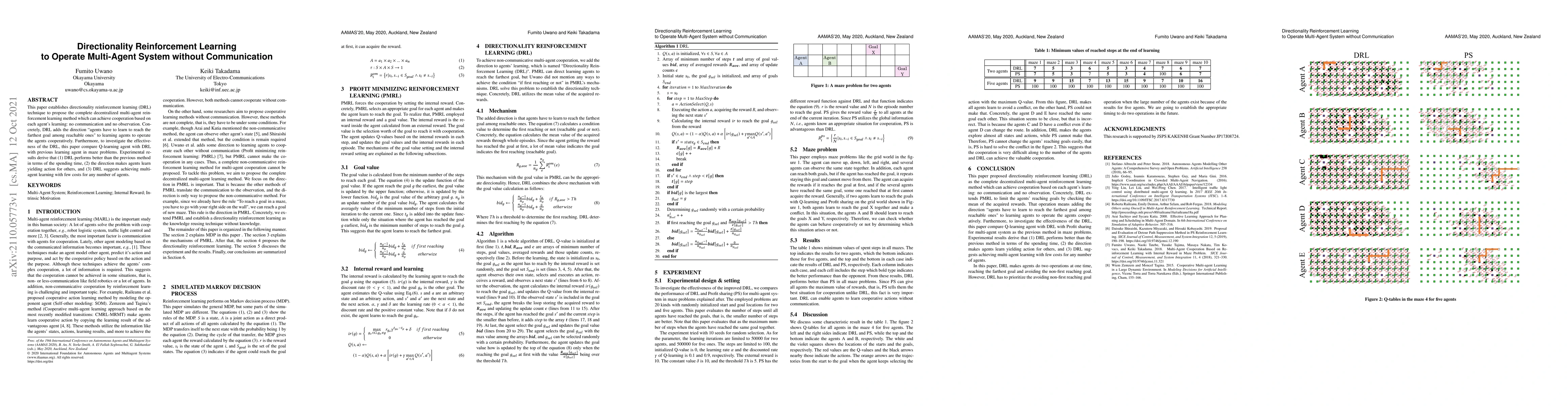 This paper introduces directionality reinforcement learning (DRL) for a decentralized multi-agent system that operates without communication or observation. DRL enables agents to cooperatively reach the farthest goal among reachable ones, outperforming previous methods in maze problems by reducing time spent and promoting beneficial actions for others.