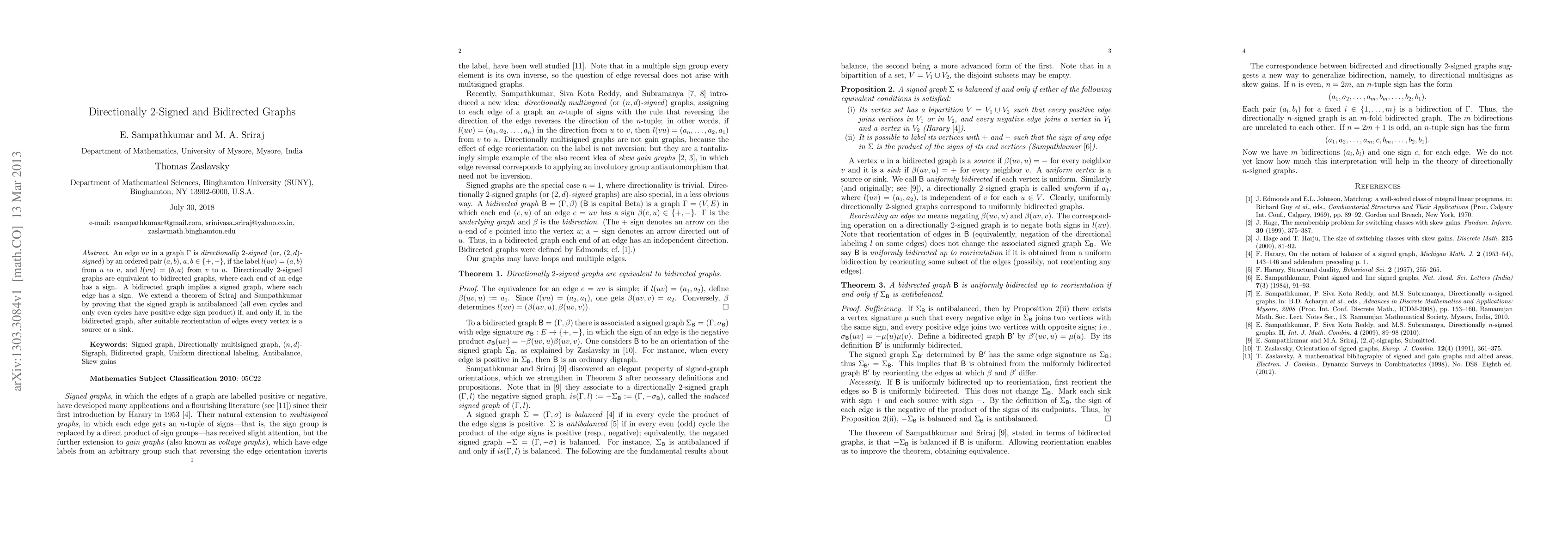 This paper explores directionally 2-signed and bidirected graphs, establishing their equivalence and proving that a signed graph is antibalanced if and only if every vertex in the bidirected graph can be reoriented to be a source or sink. The study extends a prior theorem by Sriraj and Sampathkumar.