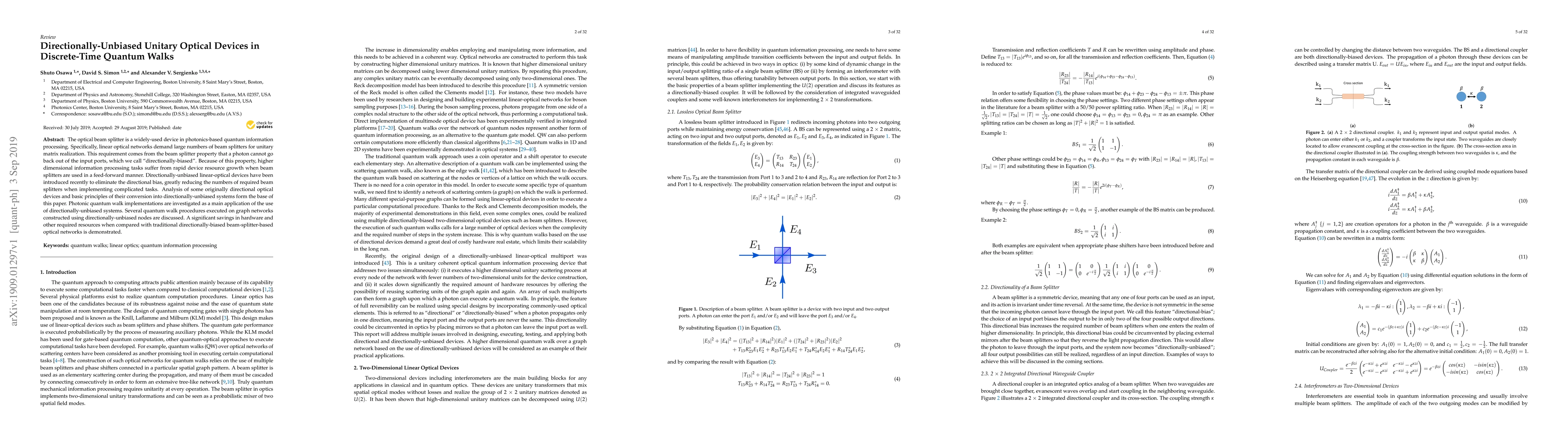 This paper explores the development of directionally-unbiased linear-optical devices to reduce resource requirements in photonic quantum information processing. It demonstrates significant savings in hardware resources when implementing photonic quantum walks using these devices compared to traditional directionally-biased beam splitters.