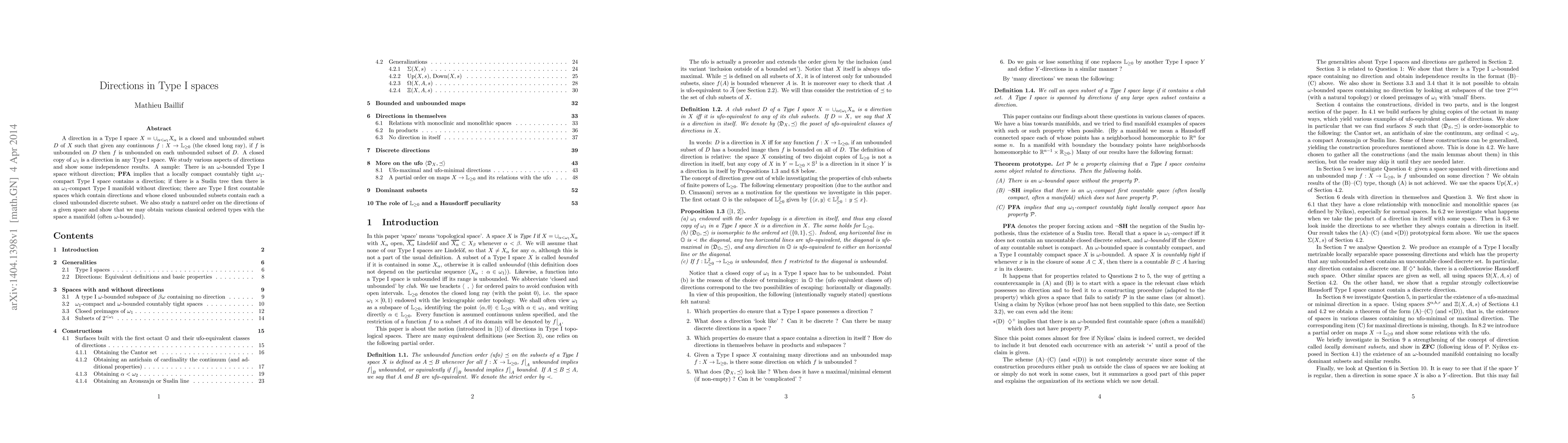 A direction in a Type I space $X=\cup_{\alpha<\omega_1}X_\alpha$ is a closed and unbounded subset $D$ of $X$ such that given any continuous $f:X\to\mathbb{L}_{\ge 0}$ (the closed long ray), if $f$ is unbounded on $D$ then $f$ is unbounded on each unbounded subset of $D$. A closed copy of $\omega_1$ is a direction in any Type I space. We study various aspects of directions and show some independence results. A sample: There is an $\omega$-bounded Type I space without direction; PFA implies that a locally compact countably tight $\omega_1$-compact Type I space contains a direction; if there is a Suslin tree then there is an $\omega_1$-compact Type I manifold without direction; there are Type I first countable spaces which contain directions and whose closed unbounded subsets contain each a closed unbounded discrete subset. We also study a naturel order on the directions of a given space and show that we may obtain various classical ordered types with the space a manifold (often $\omega$-bounded).