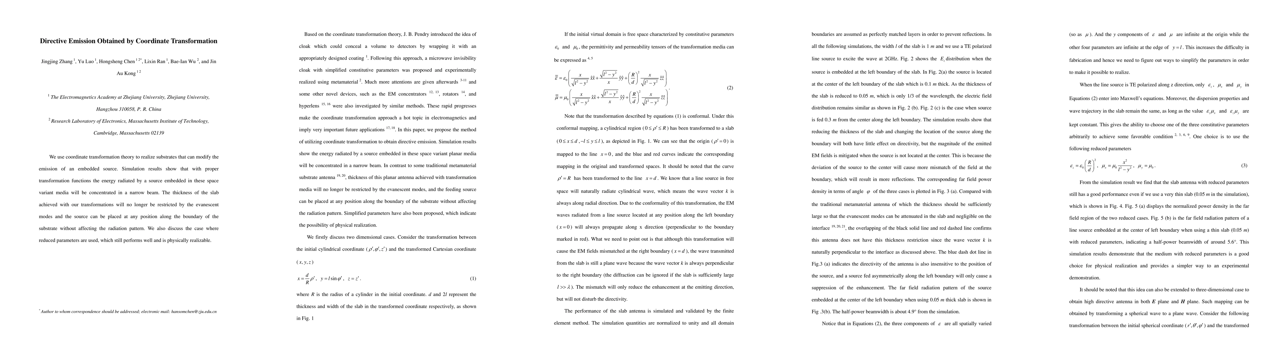 We use coordinate transformation theory to realize substrates that can modify the emission of an embedded source. Simulation results show that with proper transformation functions the energy radiated by a source embedded in these space variant media will be concentrated in a narrow beam. The thickness of the slab achieved with our transformations will no longer be restricted by the evanescent modes and the source can be placed at any position along the boundary of the substrate without affecting the radiation pattern. We also discuss the case where reduced parameters are used, which still performs well and is physically realizable.