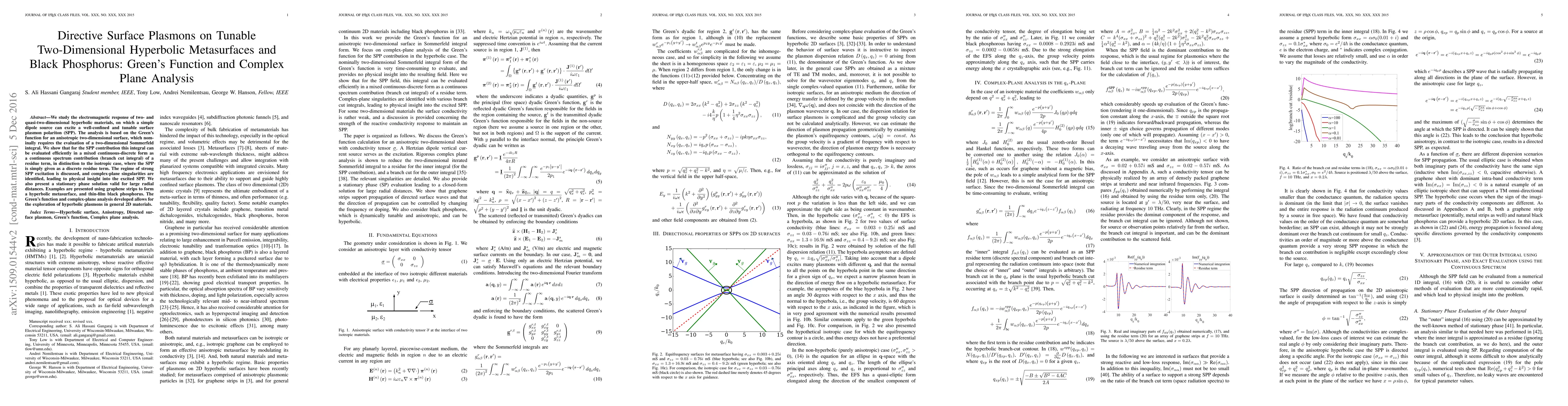 We study the electromagnetic response of two- and quasi-two-dimensional hyperbolic materials, on which a simple dipole source can excite a well-confined and tunable surface plasmon polariton (SPP). The analysis is based on the Green's function for an anisotropic two-dimensional surface, which nominally requires the evaluation of a two-dimensional Sommerfeld integral. We show that for the SPP contribution this integral can be evaluated efficiently in a mixed continuous-discrete form as a continuous spectrum contribution (branch cut integral) of a residue term, in distinction to the isotropic case, where the SPP is simply given as a discrete residue term. The regime of strong SPP excitation is discussed, and complex-plane singularities are identified, leading to physical insight into the excited SPP. We also present a stationary phase solution valid for large radial distances. Examples are presented using graphene strips to form a hyperbolic metasurface, and thin-film black phosphorus. The Green's function and complex-plane analysis developed allows for the exploration of hyperbolic plasmons in general 2D materials.
