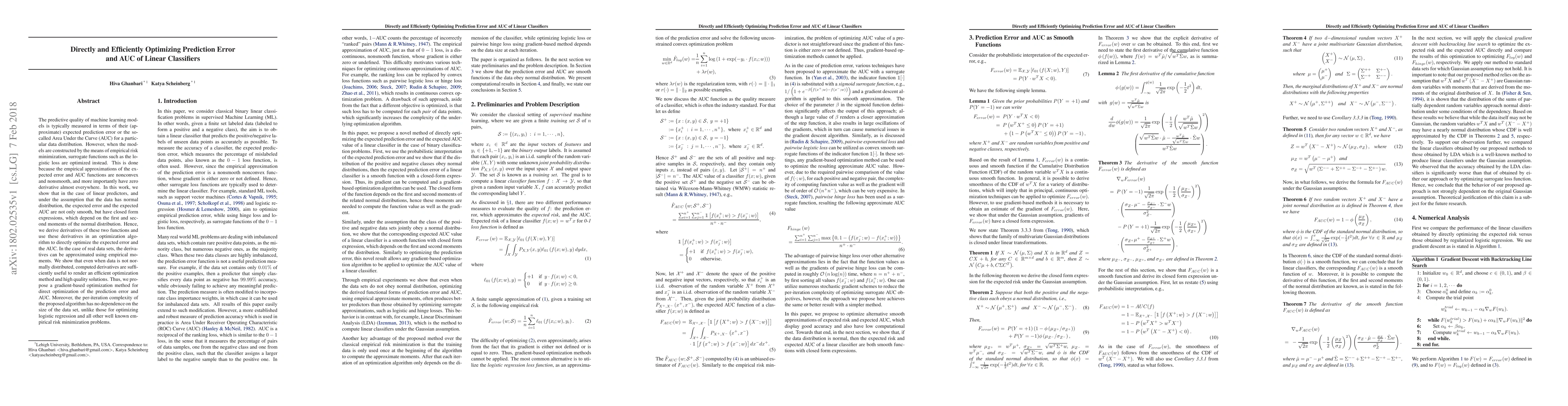 The predictive quality of machine learning models is typically measured in terms of their (approximate) expected prediction error or the so-called Area Under the Curve (AUC) for a particular data distribution. However, when the models are constructed by the means of empirical risk minimization, surrogate functions such as the logistic loss are optimized instead. This is done because the empirical approximations of the expected error and AUC functions are nonconvex and nonsmooth, and more importantly have zero derivative almost everywhere. In this work, we show that in the case of linear predictors, and under the assumption that the data has normal distribution, the expected error and the expected AUC are not only smooth, but have closed form expressions, which depend on the first and second moments of the normal distribution. Hence, we derive derivatives of these two functions and use these derivatives in an optimization algorithm to directly optimize the expected error and the AUC. In the case of real data sets, the derivatives can be approximated using empirical moments. We show that even when data is not normally distributed, computed derivatives are sufficiently useful to render an efficient optimization method and high quality solutions. Thus, we propose a gradient-based optimization method for direct optimization of the prediction error and AUC. Moreover, the per-iteration complexity of the proposed algorithm has no dependence on the size of the data set, unlike those for optimizing logistic regression and all other well known empirical risk minimization problems.