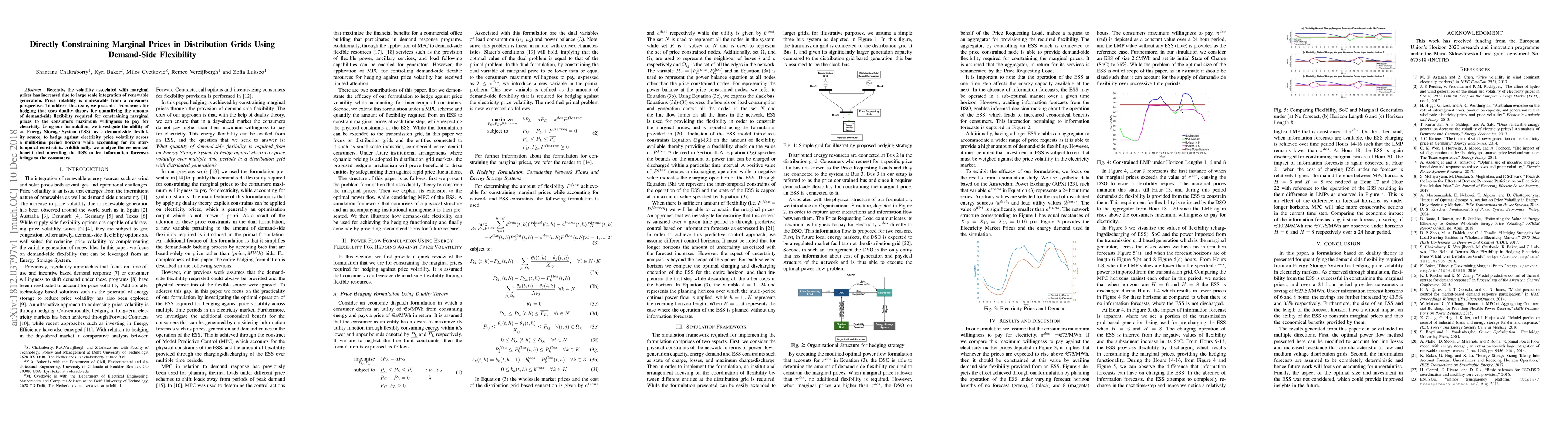 Recently, the volatility associated with marginal prices has increased due to large scale integration of renewable generation. Price volatility is undesirable from a consumer perspective. To address this issue, we present a framework for hedging that uses duality theory for quantifying the amount of demand-side flexibility required for constraining marginal prices to the consumers maximum willingness to pay for electricity. Using our formulation, we investigate the ability of an Energy Storage System (ESS), as a demand-side flexibility source, to hedge against electricity price volatility across a multi-time period horizon while accounting for its inter-temporal constraints. Additionally, we analyze the economical benefit that operating the ESS under information forecasts brings to the consumers.