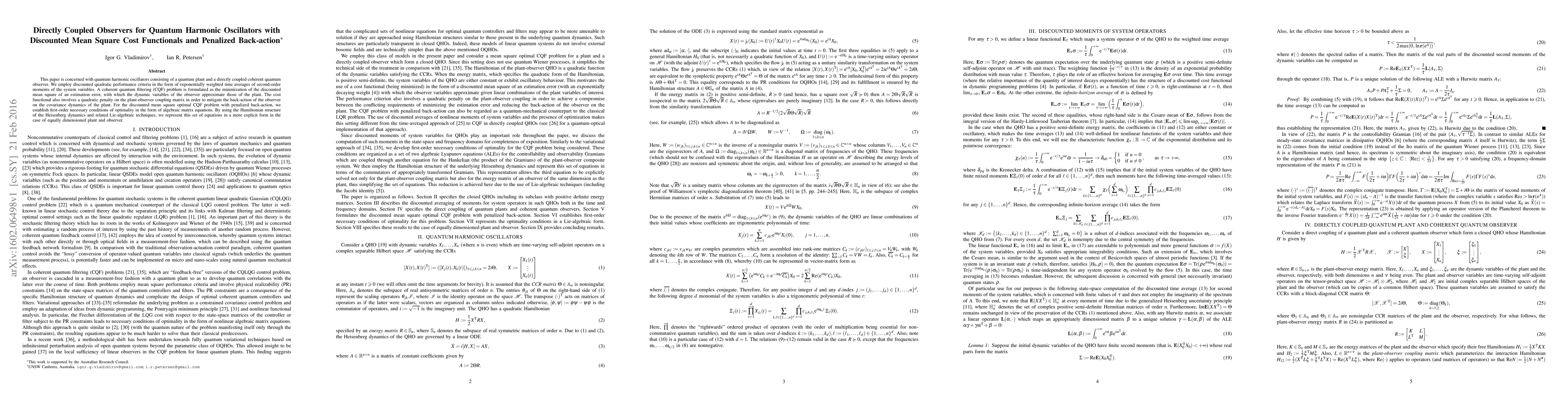 This paper develops a quantum filtering approach for harmonic oscillators, focusing on minimizing discounted mean square error with a penalty on observer-plant coupling to mitigate back-action. It establishes necessary optimality conditions using Hamiltonian dynamics and Lie-algebraic techniques.