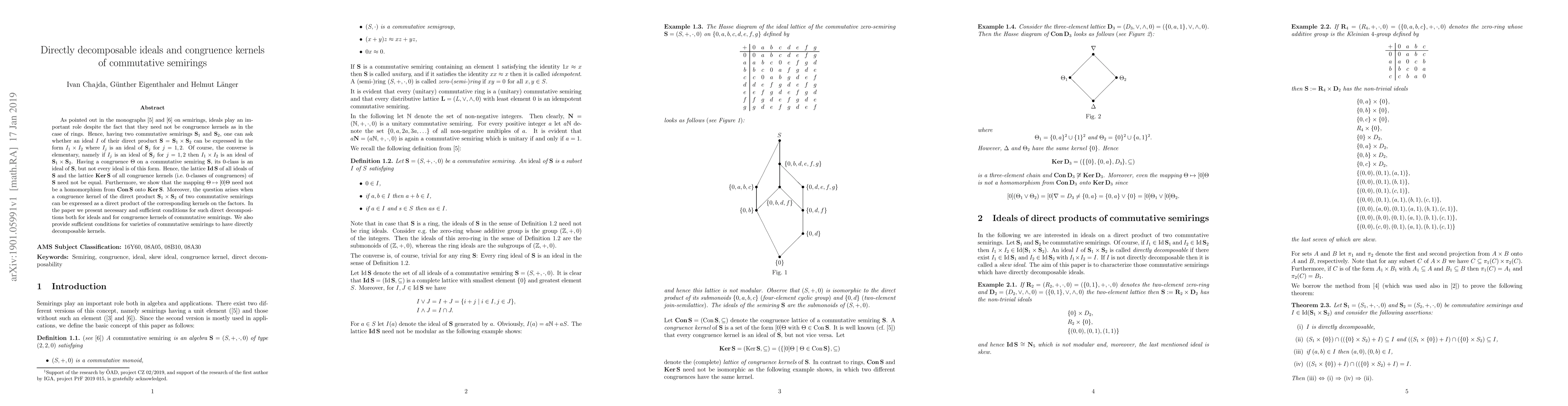 This paper investigates the structure of ideals and congruence kernels in commutative semirings, focusing on their direct decomposability. It establishes necessary and sufficient conditions for the direct product of ideals and congruence kernels, and explores when these kernels can be expressed as direct products of kernels from the factor semirings.
