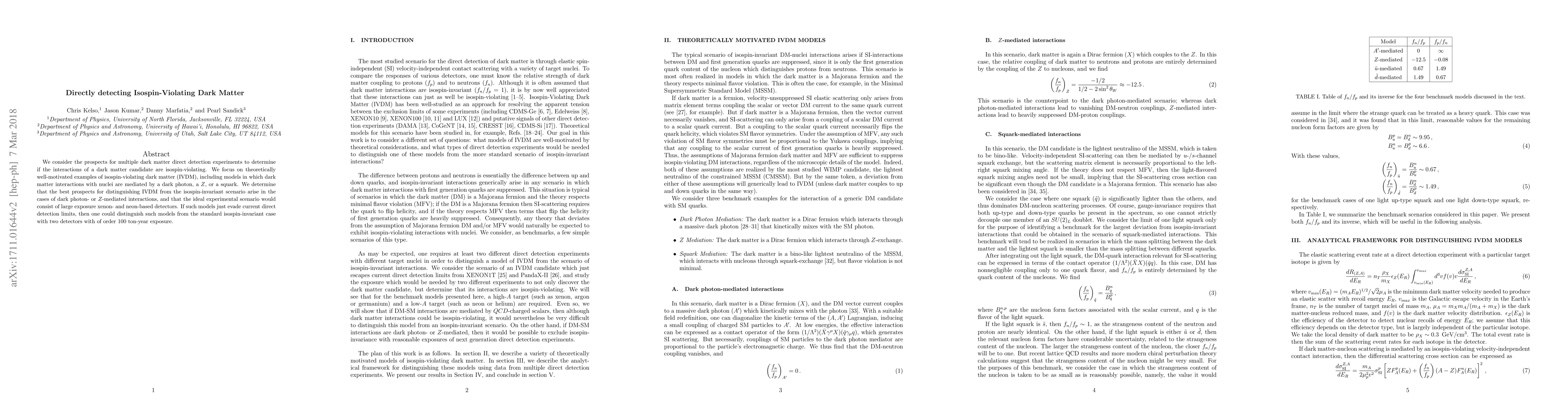 This paper explores the potential for direct detection experiments to identify isospin-violating dark matter (IVDM) through interactions mediated by dark photons, Z bosons, or squarks. The best prospects for distinguishing IVDM from isospin-invariant scenarios are found in dark photon- or Z-mediated interactions, with large xenon- and neon-based detectors offering the most promise.