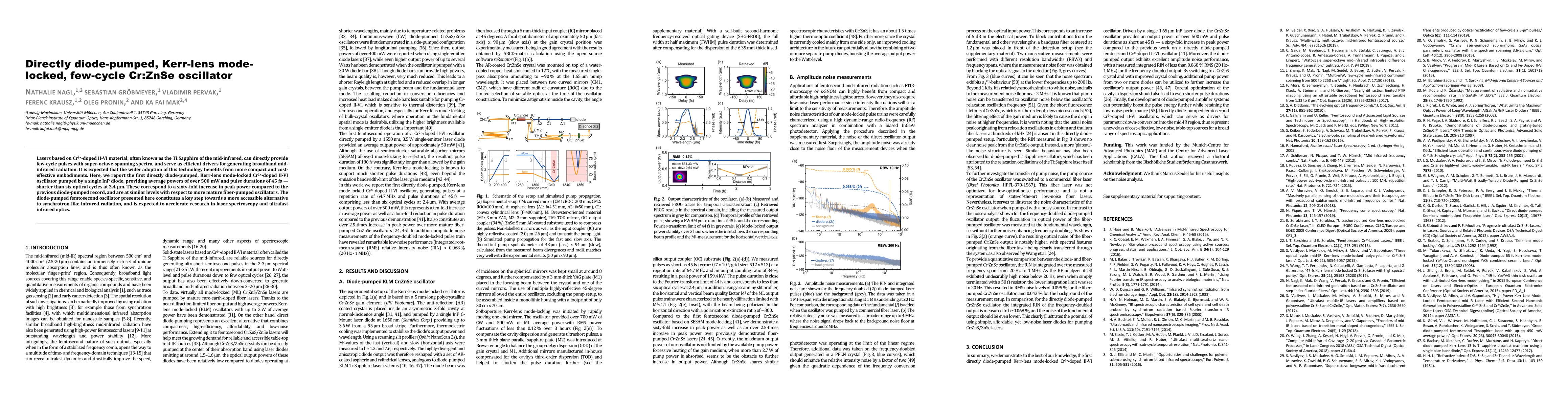 Lasers based on Cr$^{2+}$-doped II-VI material, often known as the Ti:Sapphire of the mid-infrared, can directly provide few-cycle pulses with super-octave-spanning spectra, and serve as efficient drivers for generating broadband mid-infrared radiation. It is expected that the wider adoption of this technology benefits from more compact and cost-effective embodiments. Here, we report the first directly diode-pumped, Kerr-lens mode-locked Cr$^{2+}$-doped II-VI oscillator pumped by a single InP diode, providing average powers of over 500 mW and pulse durations of 45 fs - shorter than six optical cycles at 2.4 $\mu$m. These correspond to a sixty-fold increase in peak power compared to the previous diode-pumped record, and are at similar levels with respect to more mature fiber-pumped oscillators. The diode-pumped femtosecond oscillator presented here constitutes a key step towards a more accessible alternative to synchrotron-like infrared radiation, and is expected to accelerate research in laser spectroscopy and ultrafast infrared optics.